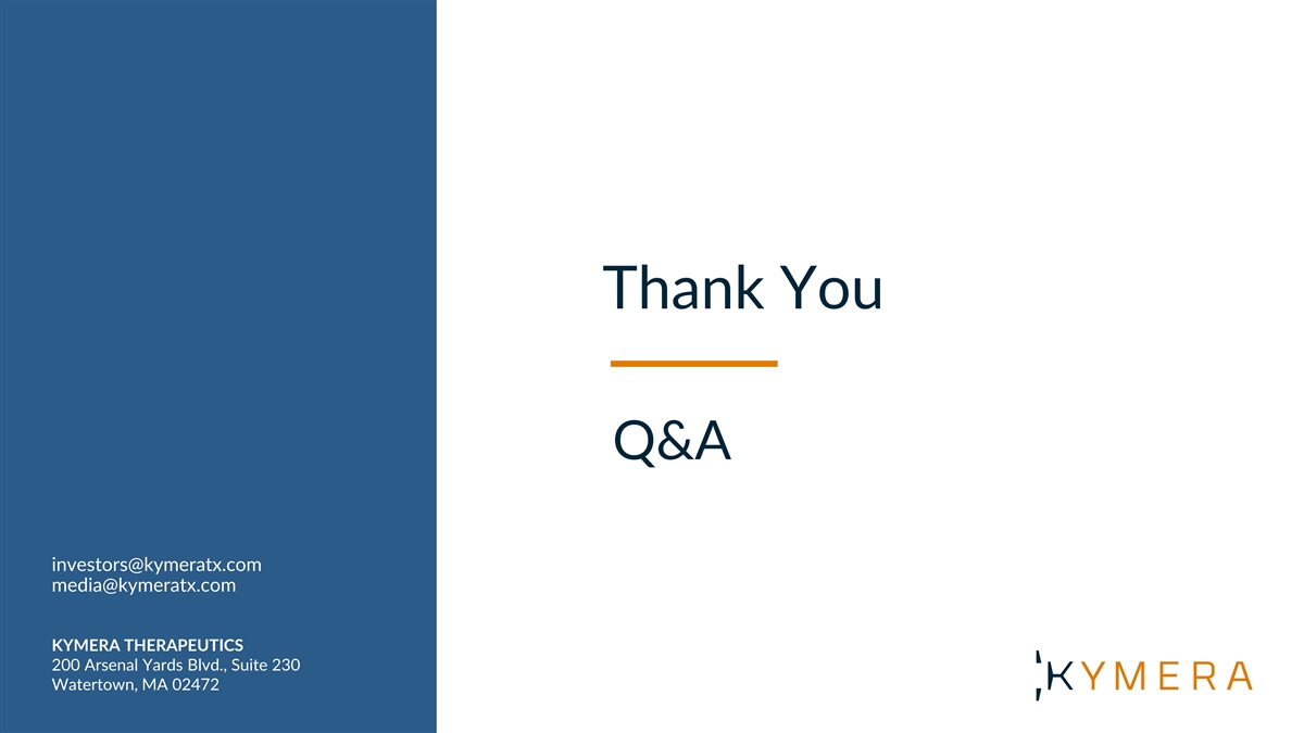 Thank You Q&A investors@kymeratx.com media@kymeratx.com KYMERA THERAPEUTICS 200 Arsenal Yards Blvd., Suite 230 Watertown, MA 02472