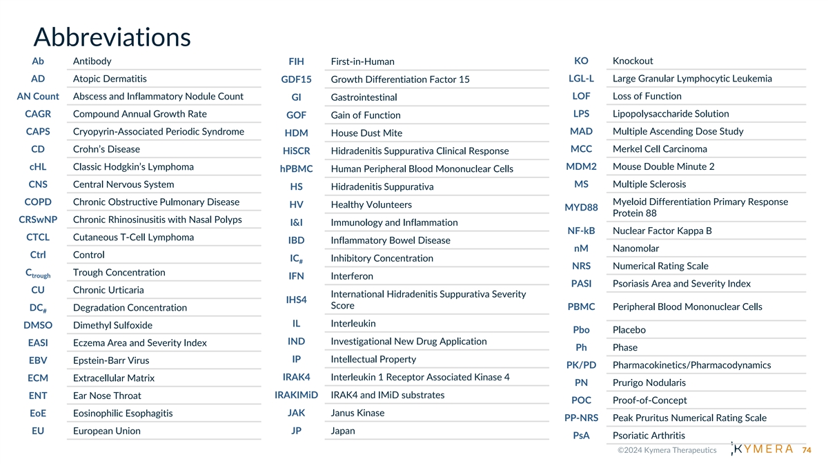 Abbreviations KO Knockout Ab Antibody FIH First-in-Human AD Atopic Dermatitis LGL-L Large Granular Lymphocytic Leukemia GDF15 Growth Differentiation Factor 15 LOF Loss of Function AN Count Abscess and Inflammatory Nodule Count GI Gastrointestinal CAGR Compound Annual Growth Rate LPS Lipopolysaccharide Solution GOF Gain of Function CAPS Cryopyrin-Associated Periodic Syndrome MAD Multiple Ascending Dose Study HDM House Dust Mite CD Crohn’s Disease MCC Merkel Cell Carcinoma HiSCR Hidradenitis Suppurativa Clinical Response cHL Classic Hodgkin’s Lymphoma MDM2 Mouse Double Minute 2 hPBMC Human Peripheral Blood Mononuclear Cells MS Multiple Sclerosis CNS Central Nervous System HS Hidradenitis Suppurativa COPD Chronic Obstructive Pulmonary Disease Myeloid Differentiation Primary Response HV Healthy Volunteers MYD88 Protein 88 CRSwNP Chronic Rhinosinusitis with Nasal Polyps I&I Immunology and Inflammation NF-kB Nuclear Factor Kappa B CTCL Cutaneous T-Cell Lymphoma IBD Inflammatory Bowel Disease nM Nanomolar Ctrl Control IC Inhibitory Concentration # NRS Numerical Rating Scale C Trough Concentration trough IFN Interferon PASI Psoriasis Area and Severity Index CU Chronic Urticaria International Hidradenitis Suppurativa Severity IHS4 Score PBMC Peripheral Blood Mononuclear Cells DC Degradation Concentration # IL Interleukin DMSO Dimethyl Sulfoxide Pbo Placebo IND Investigational New Drug Application EASI Eczema Area and Severity Index Ph Phase IP Intellectual Property EBV Epstein-Barr Virus PK/PD Pharmacokinetics/Pharmacodynamics IRAK4 Interleukin 1 Receptor Associated Kinase 4 ECM Extracellular Matrix PN Prurigo Nodularis ENT Ear Nose Throat IRAKIMiD IRAK4 and IMiD substrates POC Proof-of-Concept JAK Janus Kinase EoE Eosinophilic Esophagitis PP-NRS Peak Pruritus Numerical Rating Scale EU European Union JP Japan PsA Psoriatic Arthritis 74