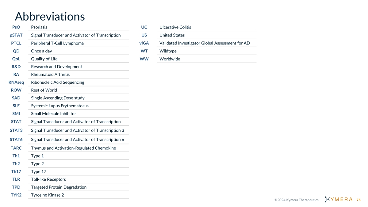 Abbreviations PsO Psoriasis UC Ulcerative Colitis pSTAT Signal Transducer and Activator of Transcription US United States vIGA Validated Investigator Global Assessment for AD PTCL Peripheral T-Cell Lymphoma QD Once a day WT Wildtype QoL Quality of Life WW Worldwide R&D Research and Development RA Rheumatoid Arthritis RNAseq Ribonucleic Acid Sequencing ROW Rest of World SAD Single Ascending Dose study SLE Systemic Lupus Erythematosus SMI Small Molecule Inhibitor STAT Signal Transducer and Activator of Transcription STAT3 Signal Transducer and Activator of Transcription 3 STAT6 Signal Transducer and Activator of Transcription 6 TARC Thymus and Activation-Regulated Chemokine Th1 Type 1 Th2 Type 2 Th17 Type 17 TLR Toll-like Receptors TPD Targeted Protein Degradation TYK2 Tyrosine Kinase 2 75