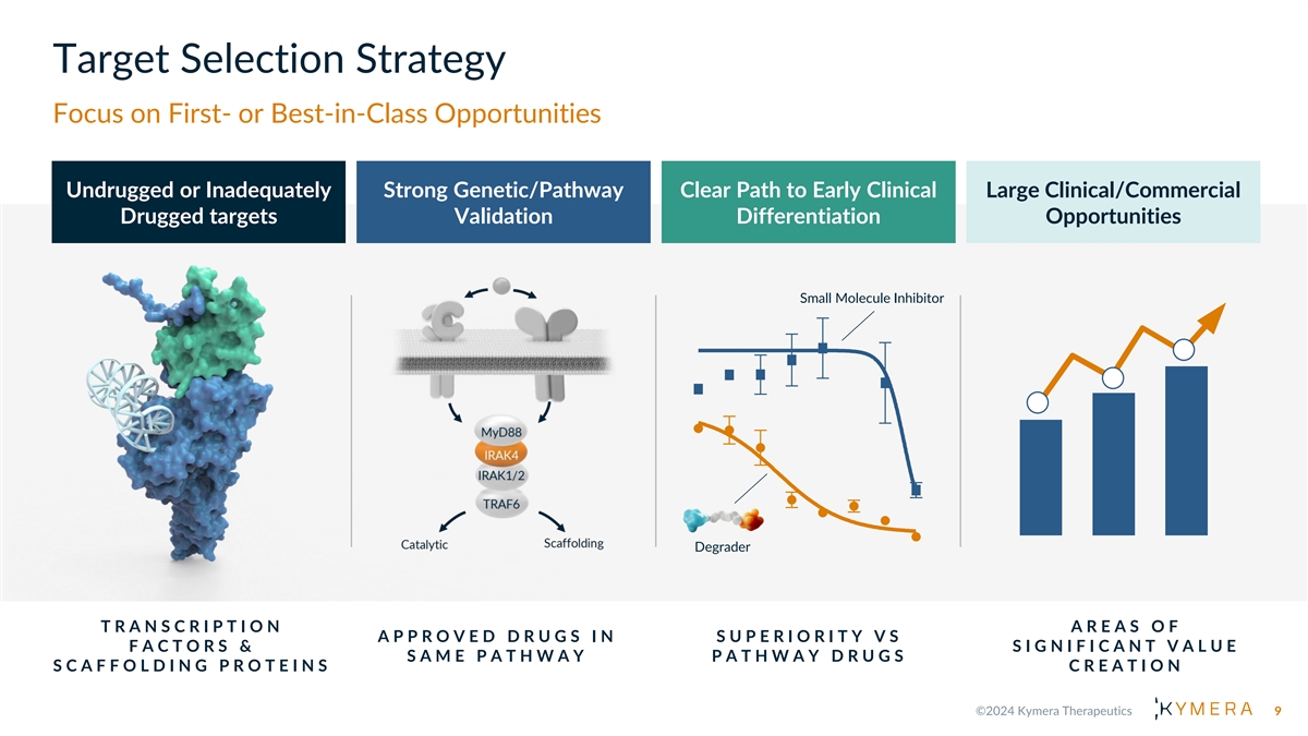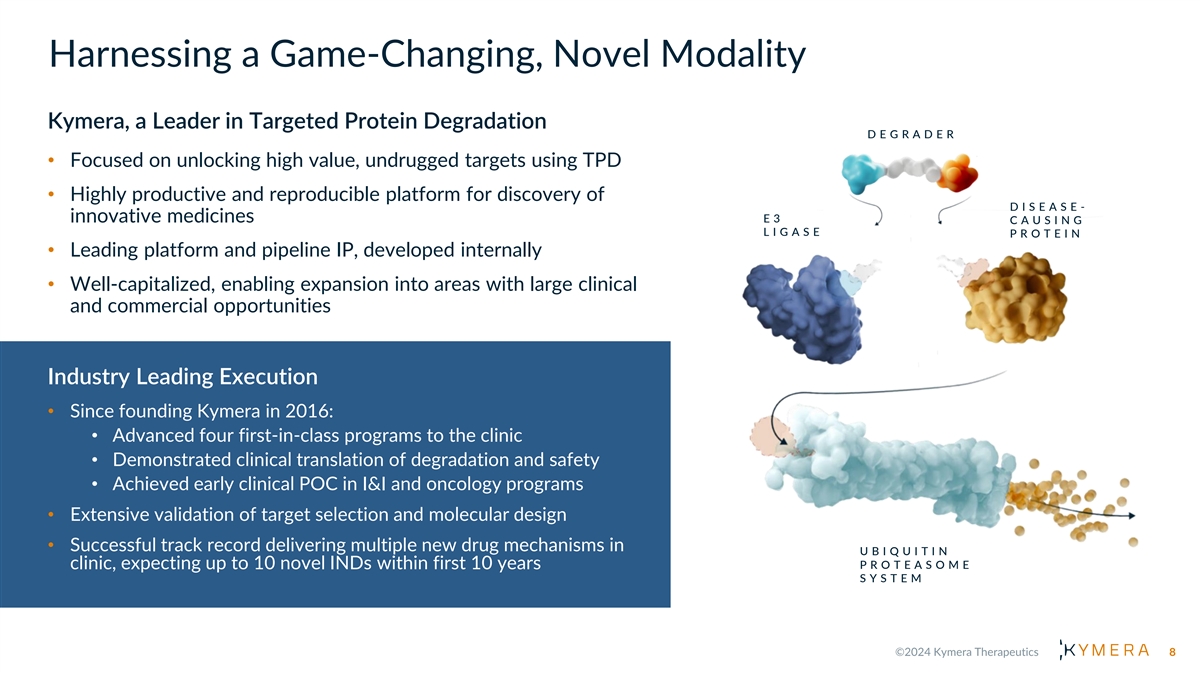 Harnessing a Game-Changing, Novel Modality Kymera, a Leader in Targeted Protein Degradation D E G R A D E R • Focused on unlocking high value, undrugged targets using TPD • Highly productive and reproducible platform for discovery of D I S E A S E - innovative medicines E3 C A U S I N G L I G A S E P R O T E I N • Leading platform and pipeline IP, developed internally • Well-capitalized, enabling expansion into areas with large clinical and commercial opportunities Industry Leading Execution • Since founding Kymera in 2016: • Advanced four first-in-class programs to the clinic • Demonstrated clinical translation of degradation and safety • Achieved early clinical POC in I&I and oncology programs • Extensive validation of target selection and molecular design • Successful track record delivering multiple new drug mechanisms in U B I Q U I T I N P R O T E A S O M E clinic, expecting up to 10 novel INDs within first 10 years S Y S T E M 8