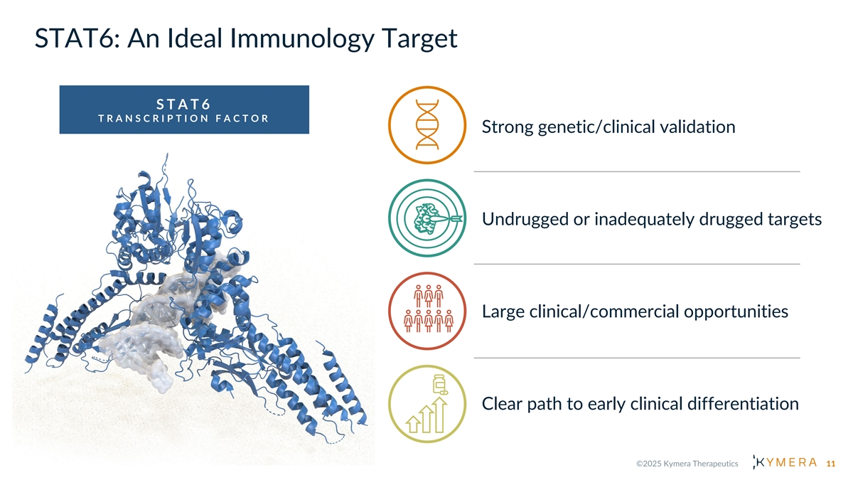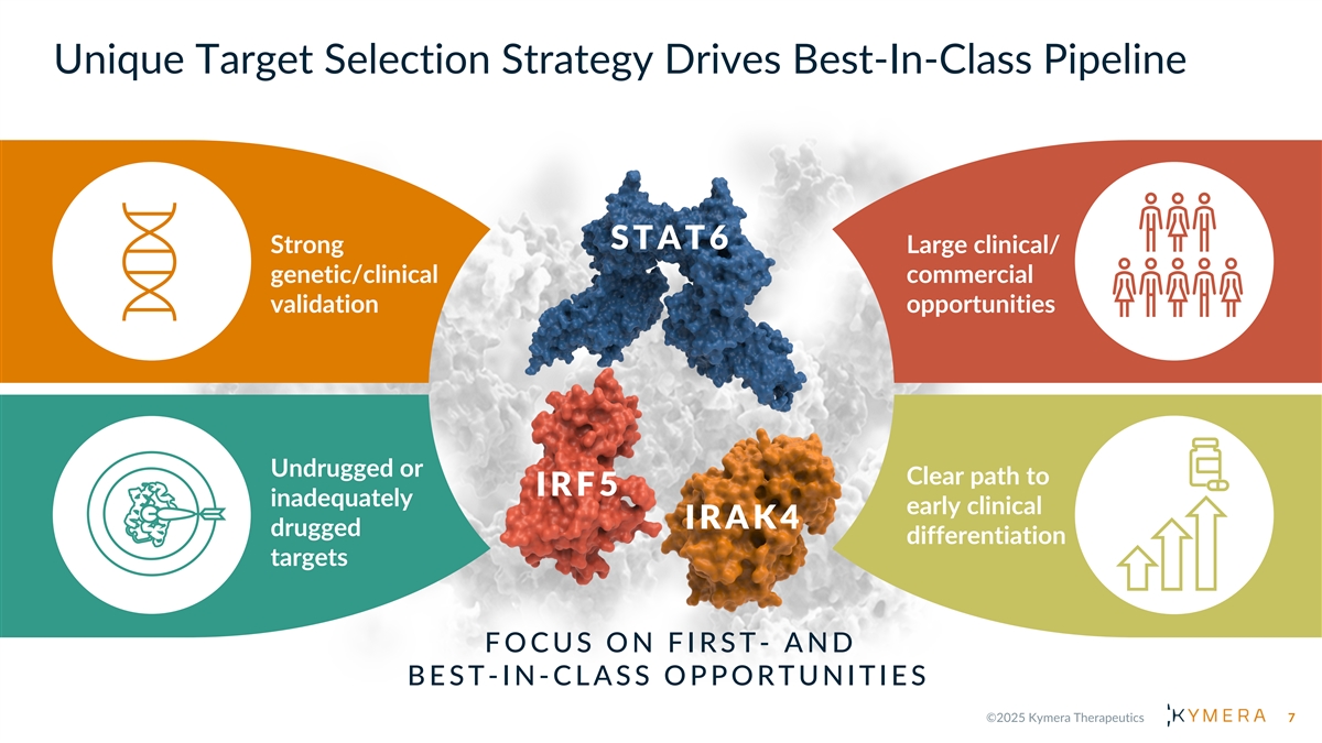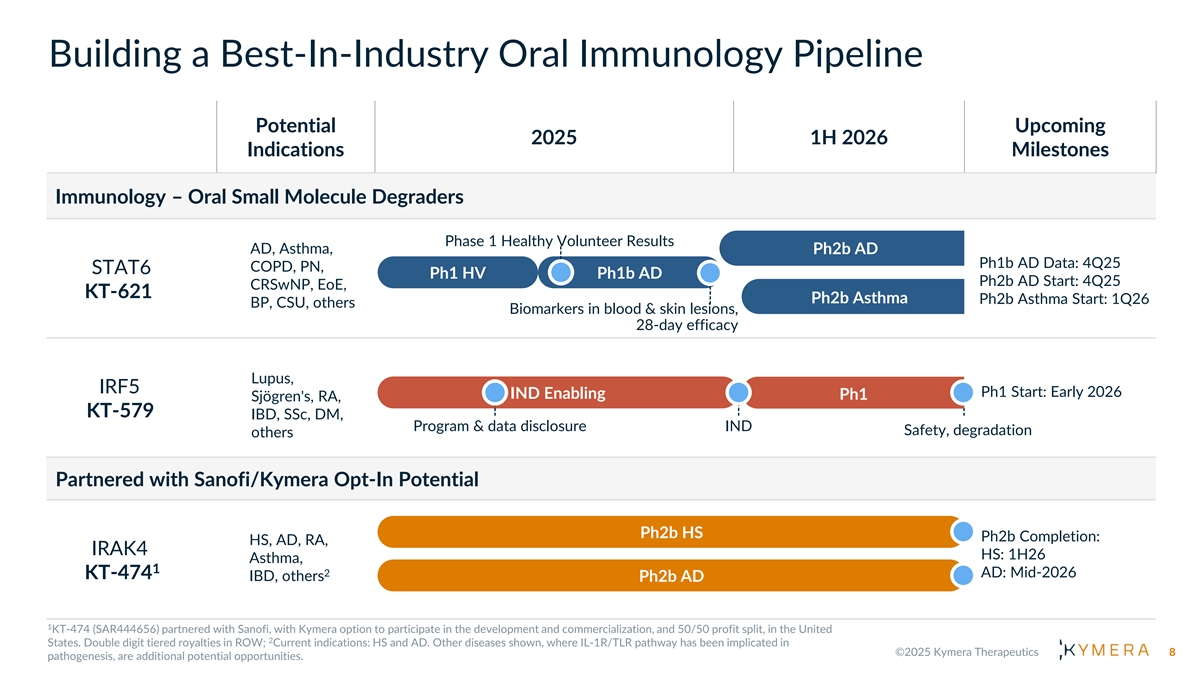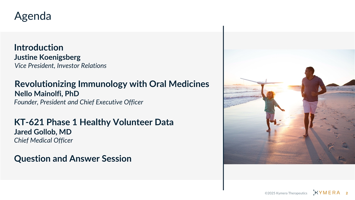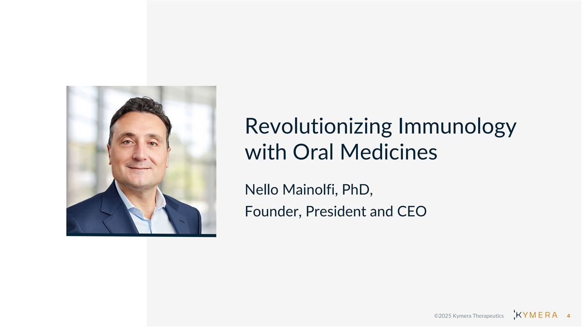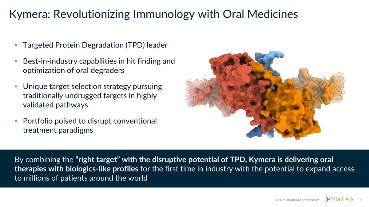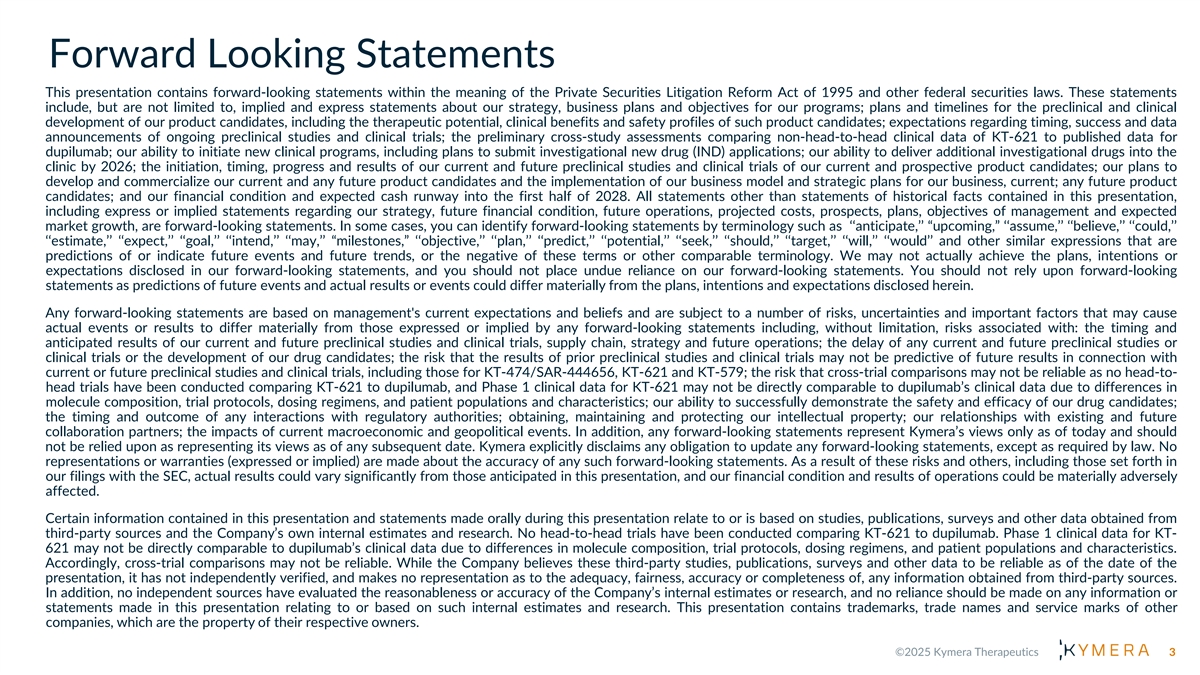 Forward Looking Statements This presentation contains forward-looking statements within the meaning of the Private Securities Litigation Reform Act of 1995 and other federal securities laws. These statements include, but are not limited to, implied and express statements about our strategy, business plans and objectives for our programs; plans and timelines for the preclinical and clinical development of our product candidates, including the therapeutic potential, clinical benefits and safety profiles of such product candidates; expectations regarding timing, success and data announcements of ongoing preclinical studies and clinical trials; the preliminary cross-study assessments comparing non-head-to-head clinical data of KT-621 to published data for dupilumab; our ability to initiate new clinical programs, including plans to submit investigational new drug (IND) applications; our ability to deliver additional investigational drugs into the clinic by 2026; the initiation, timing, progress and results of our current and future preclinical studies and clinical trials of our current and prospective product candidates; our plans to develop and commercialize our current and any future product candidates and the implementation of our business model and strategic plans for our business, current; any future product candidates; and our financial condition and expected cash runway into the first half of 2028. All statements other than statements of historical facts contained in this presentation, including express or implied statements regarding our strategy, future financial condition, future operations, projected costs, prospects, plans, objectives of management and expected market growth, are forward-looking statements. In some cases, you can identify forward-looking statements by terminology such as ‘‘anticipate,’’ “upcoming,” ‘‘assume,’’ ‘‘believe,’’ ‘‘could,’’ ‘‘estimate,’’ ‘‘expect,’’ ‘‘goal,’’ ‘‘intend,’’ ‘‘may,’’ “milestones,” ‘‘objective,’’ ‘‘plan,’’ ‘‘predict,’’ ‘‘potential,’’ ‘‘seek,’’ ‘‘should,’’ ‘‘target,’’ ‘‘will,’’ ‘‘would’’ and other similar expressions that are predictions of or indicate future events and future trends, or the negative of these terms or other comparable terminology. We may not actually achieve the plans, intentions or expectations disclosed in our forward-looking statements, and you should not place undue reliance on our forward-looking statements. You should not rely upon forward-looking statements as predictions of future events and actual results or events could differ materially from the plans, intentions and expectations disclosed herein. Any forward-looking statements are based on management's current expectations and beliefs and are subject to a number of risks, uncertainties and important factors that may cause actual events or results to differ materially from those expressed or implied by any forward-looking statements including, without limitation, risks associated with: the timing and anticipated results of our current and future preclinical studies and clinical trials, supply chain, strategy and future operations; the delay of any current and future preclinical studies or clinical trials or the development of our drug candidates; the risk that the results of prior preclinical studies and clinical trials may not be predictive of future results in connection with current or future preclinical studies and clinical trials, including those for KT-474/SAR-444656, KT-621 and KT-579; the risk that cross-trial comparisons may not be reliable as no head-to- head trials have been conducted comparing KT-621 to dupilumab, and Phase 1 clinical data for KT-621 may not be directly comparable to dupilumab’s clinical data due to differences in molecule composition, trial protocols, dosing regimens, and patient populations and characteristics; our ability to successfully demonstrate the safety and efficacy of our drug candidates; the timing and outcome of any interactions with regulatory authorities; obtaining, maintaining and protecting our intellectual property; our relationships with existing and future collaboration partners; the impacts of current macroeconomic and geopolitical events. In addition, any forward-looking statements represent Kymera’s views only as of today and should not be relied upon as representing its views as of any subsequent date. Kymera explicitly disclaims any obligation to update any forward-looking statements, except as required by law. No representations or warranties (expressed or implied) are made about the accuracy of any such forward-looking statements. As a result of these risks and others, including those set forth in our filings with the SEC, actual results could vary significantly from those anticipated in this presentation, and our financial condition and results of operations could be materially adversely affected. Certain information contained in this presentation and statements made orally during this presentation relate to or is based on studies, publications, surveys and other data obtained from third-party sources and the Company’s own internal estimates and research. No head-to-head trials have been conducted comparing KT-621 to dupilumab. Phase 1 clinical data for KT- 621 may not be directly comparable to dupilumab’s clinical data due to differences in molecule composition, trial protocols, dosing regimens, and patient populations and characteristics. Accordingly, cross-trial comparisons may not be reliable. While the Company believes these third-party studies, publications, surveys and other data to be reliable as of the date of the presentation, it has not independently verified, and makes no representation as to the adequacy, fairness, accuracy or completeness of, any information obtained from third-party sources. In addition, no independent sources have evalua