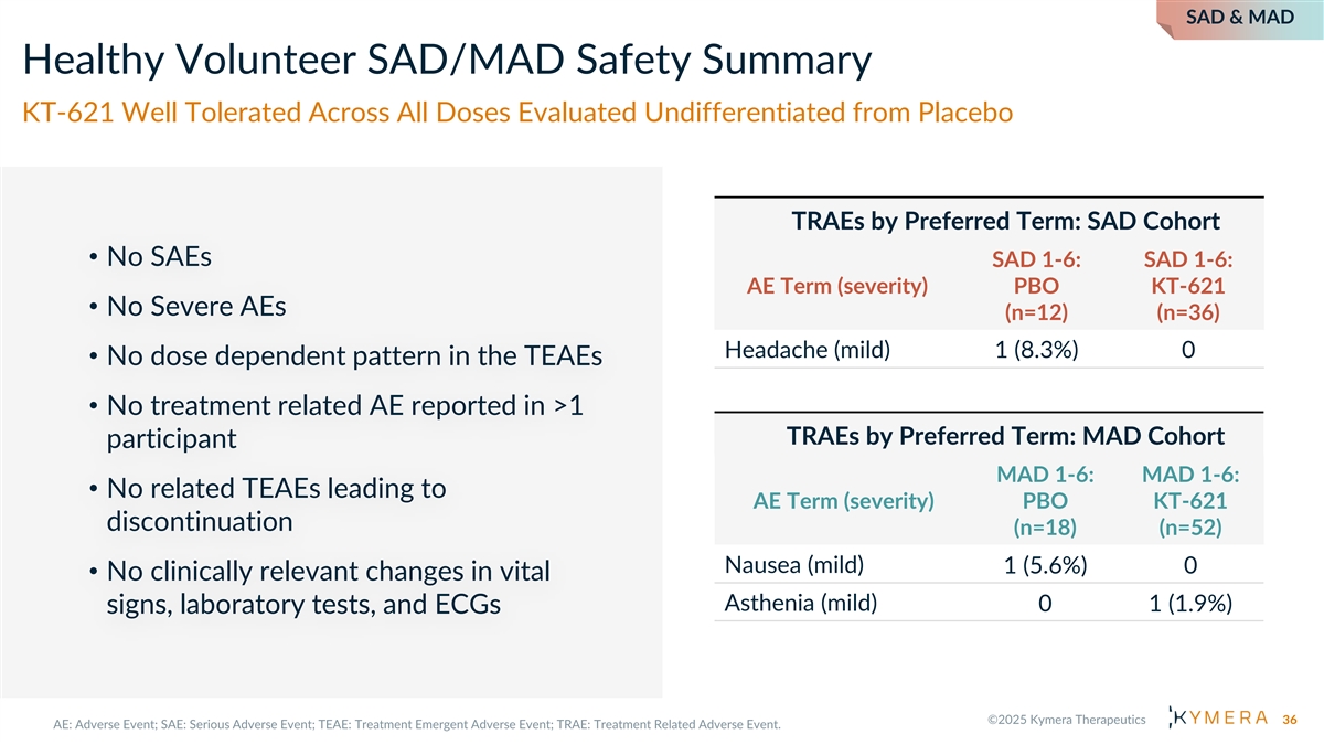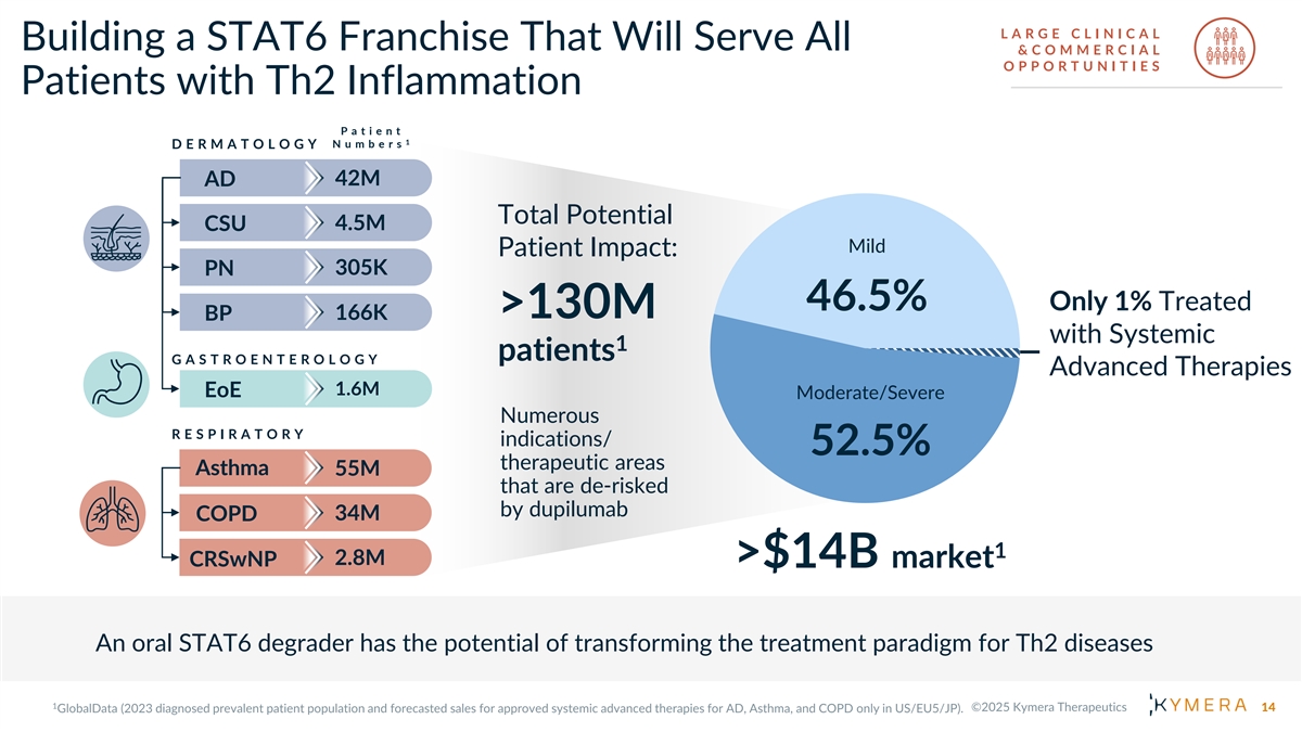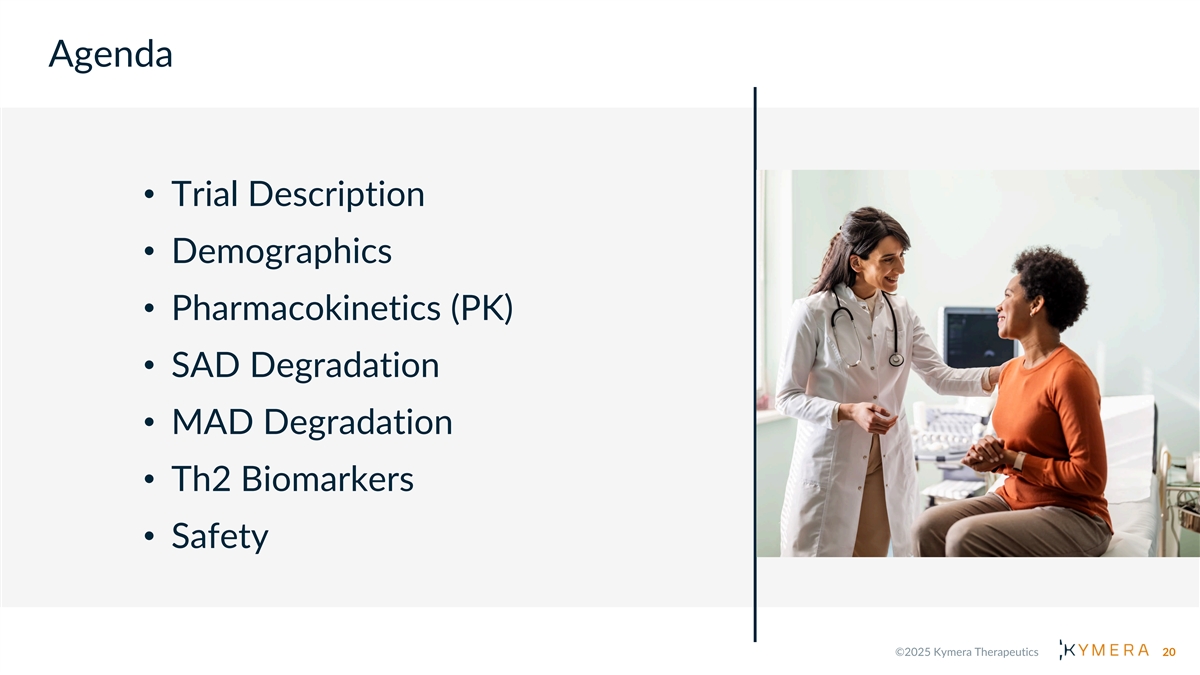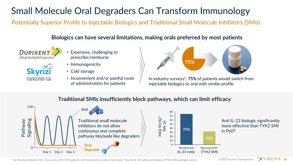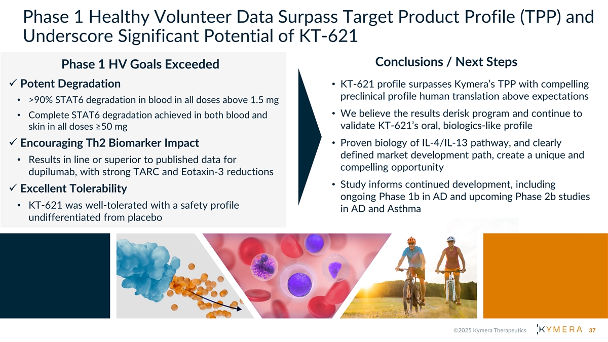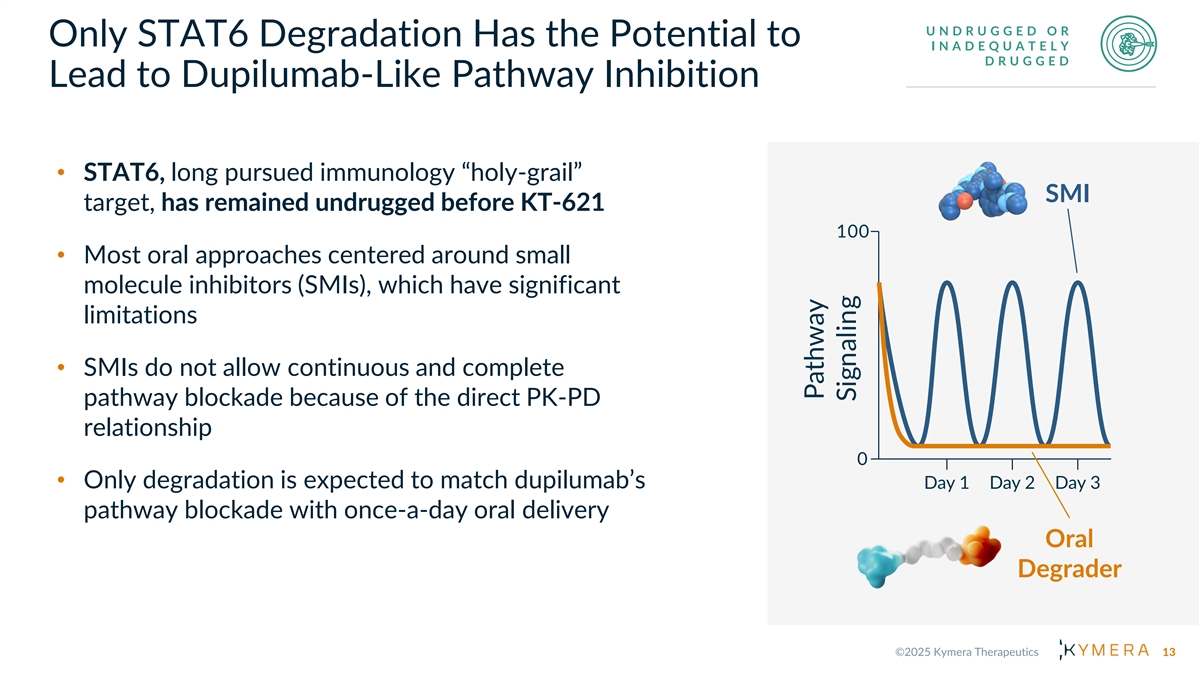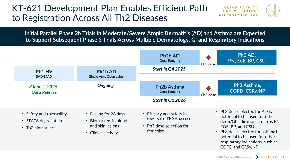 Forward Looking Statements This presentation contains forward-looking statements within the meaning of the Private Securities Litigation Reform Act of 1995 and other federal securities laws. These statements include, but are not limited to, implied and express statements about our strategy, business plans and objectives for our programs; plans and timelines for the preclinical and clinical development of our product candidates, including the therapeutic potential, clinical benefits and safety profiles of such product candidates; expectations regarding timing, success and data announcements of ongoing preclinical studies and clinical trials; the preliminary cross-study assessments comparing non-head-to-head clinical data of KT-621 to published data for dupilumab; our ability to initiate new clinical programs, including plans to submit investigational new drug (IND) applications; our ability to deliver additional investigational drugs into the clinic by 2026; the initiation, timing, progress and results of our current and future preclinical studies and clinical trials of our current and prospective product candidates; our plans to develop and commercialize our current and any future product candidates and the implementation of our business model and strategic plans for our business, current; any future product candidates; and our financial condition and expected cash runway into the first half of 2028. All statements other than statements of historical facts contained in this presentation, including express or implied statements regarding our strategy, future financial condition, future operations, projected costs, prospects, plans, objectives of management and expected market growth, are forward-looking statements. In some cases, you can identify forward-looking statements by terminology such as ‘‘anticipate,’’ “upcoming,” ‘‘assume,’’ ‘‘believe,’’ ‘‘could,’’ ‘‘estimate,’’ ‘‘expect,’’ ‘‘goal,’’ ‘‘intend,’’ ‘‘may,’’ “milestones,” ‘‘objective,’’ ‘‘plan,’’ ‘‘predict,’’ ‘‘potential,’’ ‘‘seek,’’ ‘‘should,’’ ‘‘target,’’ ‘‘will,’’ ‘‘would’’ and other similar expressions that are predictions of or indicate future events and future trends, or the negative of these terms or other comparable terminology. We may not actually achieve the plans, intentions or expectations disclosed in our forward-looking statements, and you should not place undue reliance on our forward-looking statements. You should not rely upon forward-looking statements as predictions of future events and actual results or events could differ materially from the plans, intentions and expectations disclosed herein. Any forward-looking statements are based on management's current expectations and beliefs and are subject to a number of risks, uncertainties and important factors that may cause actual events or results to differ materially from those expressed or implied by any forward-looking statements including, without limitation, risks associated with: the timing and anticipated results of our current and future preclinical studies and clinical trials, supply chain, strategy and future operations; the delay of any current and future preclinical studies or clinical trials or the development of our drug candidates; the risk that the results of prior preclinical studies and clinical trials may not be predictive of future results in connection with current or future preclinical studies and clinical trials, including those for KT-474/SAR-444656, KT-621 and KT-579; the risk that cross-trial comparisons may not be reliable as no head-to- head trials have been conducted comparing KT-621 to dupilumab, and Phase 1 clinical data for KT-621 may not be directly comparable to dupilumab’s clinical data due to differences in molecule composition, trial protocols, dosing regimens, and patient populations and characteristics; our ability to successfully demonstrate the safety and efficacy of our drug candidates; the timing and outcome of any interactions with regulatory authorities; obtaining, maintaining and protecting our intellectual property; our relationships with existing and future collaboration partners; the impacts of current macroeconomic and geopolitical events. In addition, any forward-looking statements represent Kymera’s views only as of today and should not be relied upon as representing its views as of any subsequent date. Kymera explicitly disclaims any obligation to update any forward-looking statements, except as required by law. No representations or warranties (expressed or implied) are made about the accuracy of any such forward-looking statements. As a result of these risks and others, including those set forth in our filings with the SEC, actual results could vary significantly from those anticipated in this presentation, and our financial condition and results of operations could be materially adversely affected. Certain information contained in this presentation and statements made orally during this presentation relate to or is based on studies, publications, surveys and other data obtained from third-party sources and the Company’s own internal estimates and research. No head-to-head trials have been conducted comparing KT-621 to dupilumab. Phase 1 clinical data for KT- 621 may not be directly comparable to dupilumab’s clinical data due to differences in molecule composition, trial protocols, dosing regimens, and patient populations and characteristics. Accordingly, cross-trial comparisons may not be reliable. While the Company believes these third-party studies, publications, surveys and other data to be reliable as of the date of the presentation, it has not independently verified, and makes no representation as to the adequacy, fairness, accuracy or completeness of, any information obtained from third-party sources. In addition, no independent sources have evalua