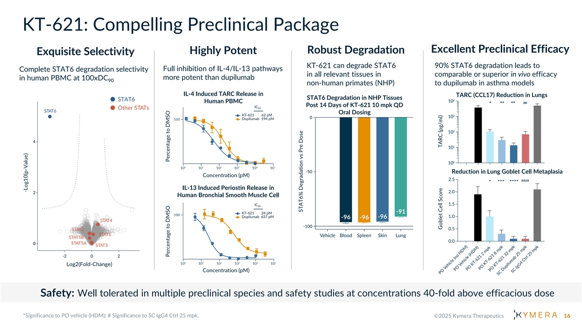 C L E A R PA T H T O KT-621 Development Plan Enables Efficient Path E AR L Y C L IN IC AL D IF F E R E N T IAT IO N to Registration Across All Th2 Diseases Initial Parallel Phase 2b Trials in Moderate/Severe Atopic Dermatitis (AD) and Asthma are Expected to Support Subsequent Phase 3 Trials Across Multiple Dermatology, GI and Respiratory Indications Ph3 AD, Ph2b AD Dose Ranging PN, EoE, BP, CSU Ph3 dose Start in Q4 2025 Ph1 HV Ph1b AD SAD-MAD Single Arm, Open Label Ph3 Asthma, Ongoing ✓ June 2, 2025 Ph2b Asthma COPD, CSRwNP Dose Ranging Data Release Ph3 dose Start in Q1 2026 • Ph3 dose selected for AD has • Safety and tolerability • Dosing for 28 days • Efficacy and safety in potential to be used for other two initial Th2 diseases • STAT6 degradation • Biomarkers in blood derm/GI indications, such as PN, and skin lesions • Ph3 dose selection for EOE, BP, and CSU • Th2 biomarkers franchise • Ph3 dose selected for asthma has • Clinical activity potential to be used for other respiratory indications, such as COPD and CRSwNP 15