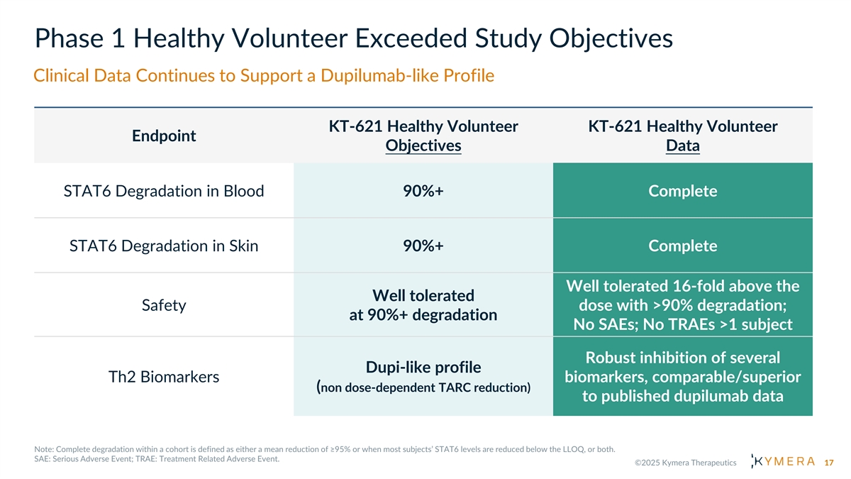 KT-621: Compelling Preclinical Package Excellent Preclinical Efficacy Robust Degradation Highly Potent Exquisite Selectivity KT-621 can degrade STAT6 90% STAT6 degradation leads to Full inhibition of IL-4/IL-13 pathways Complete STAT6 degradation selectivity in all relevant tissues in comparable or superior in vivo efficacy more potent than dupilumab in human PBMC at 100xDC 90 non-human primates (NHP) to dupilumab in asthma models IL-4 Induced TARC Release in TARC (CCL17) Reduction in Lungs STAT6 Degradation in NHP Tissues Human PBMC Post 14 Days of KT-621 10 mpk QD IC 50 Oral Dosing KT-621 62 pM 0 Dupilumab 194 pM 4 -50 Reduction in Lung Goblet Cell Metaplasia Concentration (pM) IL-13 Induced Periostin Release in 2 Human Bronchial Smooth Muscle Cell IC 50 KT-621 24 pM Dupilumab 637 pM -100 0 -2 0 2 Log2(Fold-Change) Concentration (pM) Safety: Well tolerated in multiple preclinical species and safety studies at concentrations 40-fold above efficacious dose 16 -Log10(p-Value) Percentage to DMSO Percentage to DMSO STAT6% Degradation vs Pre Dose Goblet Cell Score TARC (pg/ml)
