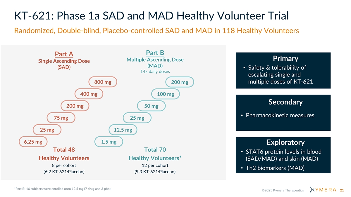 KT-621: Phase 1a SAD and MAD Healthy Volunteer Trial Randomized, Double-blind, Placebo-controlled SAD and MAD in 118 Healthy Volunteers Part B Part A Primary Multiple Ascending Dose Single Ascending Dose (MAD) (SAD) • Safety & tolerability of 14x daily doses escalating single and multiple doses of KT-621 800 mg 200 mg 400 mg 100 mg Secondary 200 mg 50 mg • Pharmacokinetic measures 75 mg 25 mg 25 mg 12.5 mg 6.25 mg 1.5 mg Exploratory Total 48 Total 70 • STAT6 protein levels in blood Healthy Volunteers Healthy Volunteers* (SAD/MAD) and skin (MAD) 8 per cohort 12 per cohort • Th2 biomarkers (MAD) (6:2 KT-621:Placebo) (9:3 KT-621:Placebo) 21
