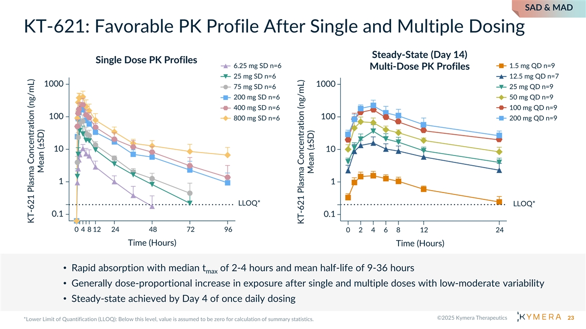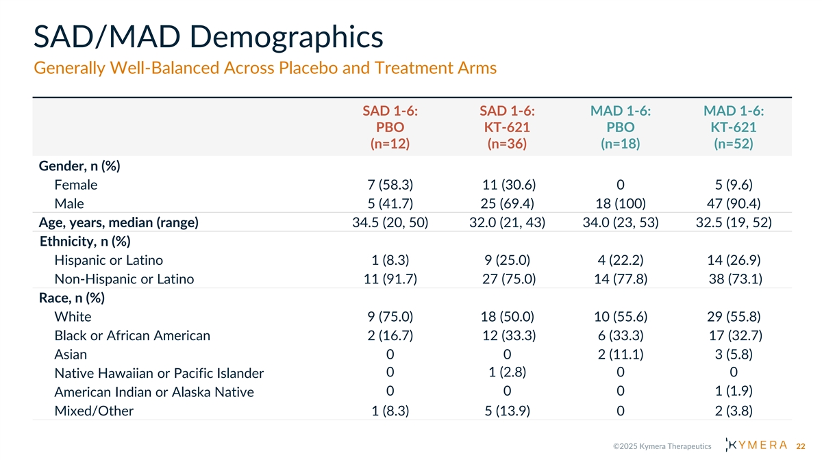 SAD/MAD Demographics Generally Well-Balanced Across Placebo and Treatment Arms SAD 1-6: SAD 1-6: MAD 1-6: MAD 1-6: PBO KT-621 PBO KT-621 (n=12) (n=36) (n=18) (n=52) Gender, n (%) Female 7 (58.3) 11 (30.6) 0 5 (9.6) Male 5 (41.7) 25 (69.4) 18 (100) 47 (90.4) Age, years, median (range) 34.5 (20, 50) 32.0 (21, 43) 34.0 (23, 53) 32.5 (19, 52) Ethnicity, n (%) Hispanic or Latino 1 (8.3) 9 (25.0) 4 (22.2) 14 (26.9) Non-Hispanic or Latino 11 (91.7) 27 (75.0) 14 (77.8) 38 (73.1) Race, n (%) White 9 (75.0) 18 (50.0) 10 (55.6) 29 (55.8) Black or African American 2 (16.7) 12 (33.3) 6 (33.3) 17 (32.7) Asian 0 0 2 (11.1) 3 (5.8) 0 1 (2.8) 0 0 Native Hawaiian or Pacific Islander 0 0 0 1 (1.9) American Indian or Alaska Native Mixed/Other 1 (8.3) 5 (13.9) 0 2 (3.8) 22