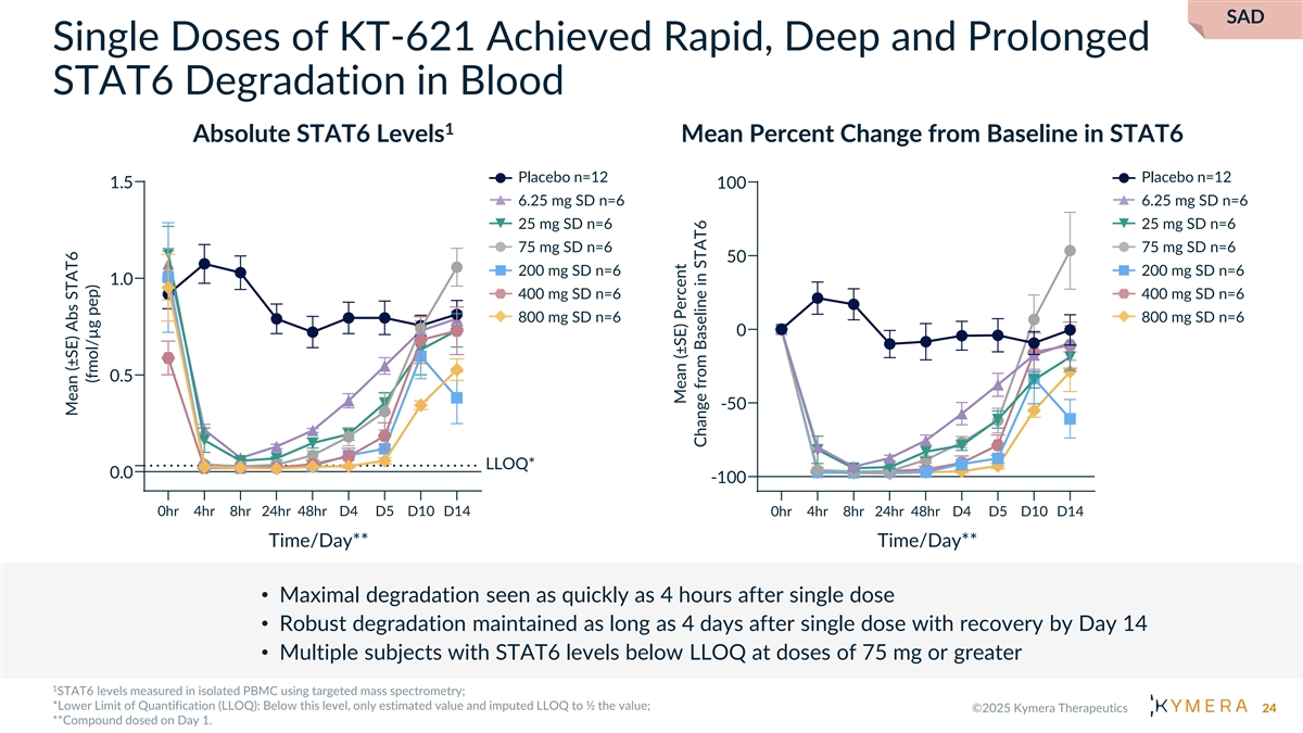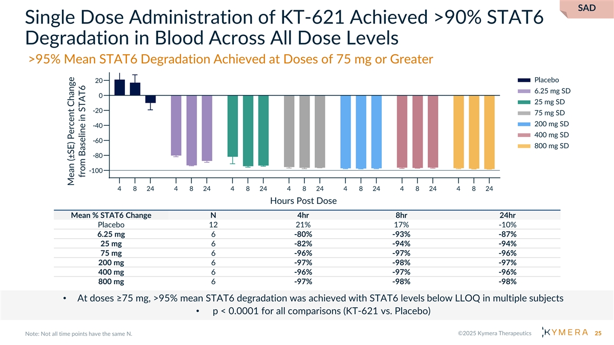 SAD Single Doses of KT-621 Achieved Rapid, Deep and Prolonged STAT6 Degradation in Blood 1 Absolute STAT6 Levels Mean Percent Change from Baseline in STAT6 Placebo n=12 Placebo n=12 1.5 100 6.25 mg SD n=6 6.25 mg SD n=6 25 mg SD n=6 25 mg SD n=6 75 mg SD n=6 75 mg SD n=6 50 200 mg SD n=6 200 mg SD n=6 1.0 400 mg SD n=6 400 mg SD n=6 800 mg SD n=6 800 mg SD n=6 0 0.5 -50 LLOQ* 0.0 -100 0hr 4hr 8hr 24hr 48hr D4 D5 D10 D14 0hr 4hr 8hr 24hr 48hr D4 D5 D10 D14 Time/Day** Time/Day** • Maximal degradation seen as quickly as 4 hours after single dose • Robust degradation maintained as long as 4 days after single dose with recovery by Day 14 • Multiple subjects with STAT6 levels below LLOQ at doses of 75 mg or greater 24 Mean (±SE) Abs STAT6 (fmol/µg pep) Mean (±SE) Percent Change from Baseline in STAT6