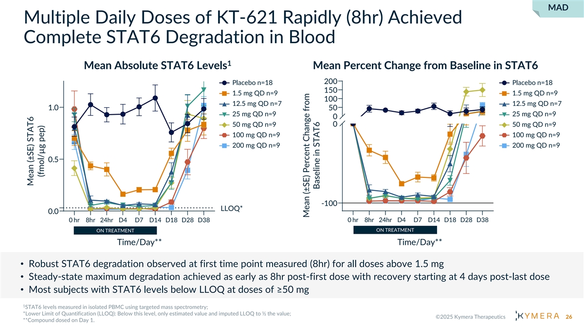 SAD Single Dose Administration of KT-621 Achieved >90% STAT6 Degradation in Blood Across All Dose Levels >95% Mean STAT6 Degradation Achieved at Doses of 75 mg or Greater Placebo 20 6.25 mg SD 0 25 mg SD -20 75 mg SD 200 mg SD -40 400 mg SD -60 800 mg SD -80 -100 4 8 24 4 8 24 4 8 24 4 8 24 4 8 24 4 8 24 4 8 24 Hours Post Dose Mean % STAT6 Change N 4hr 8hr 24hr Placebo 12 21% 17% -10% 6.25 mg 6 -80% -93% -87% 25 mg 6 -82% -94% -94% 75 mg 6 -96% -97% -96% 200 mg 6 -97% -98% -97% 400 mg 6 -96% -97% -96% 800 mg 6 -97% -98% -98% • At doses ≥75 mg, >95% mean STAT6 degradation was achieved with STAT6 levels below LLOQ in multiple subjects • p < 0.0001 for all comparisons (KT-621 vs. Placebo) 25 Mean (±SE) Percent Change from Baseline in STAT6