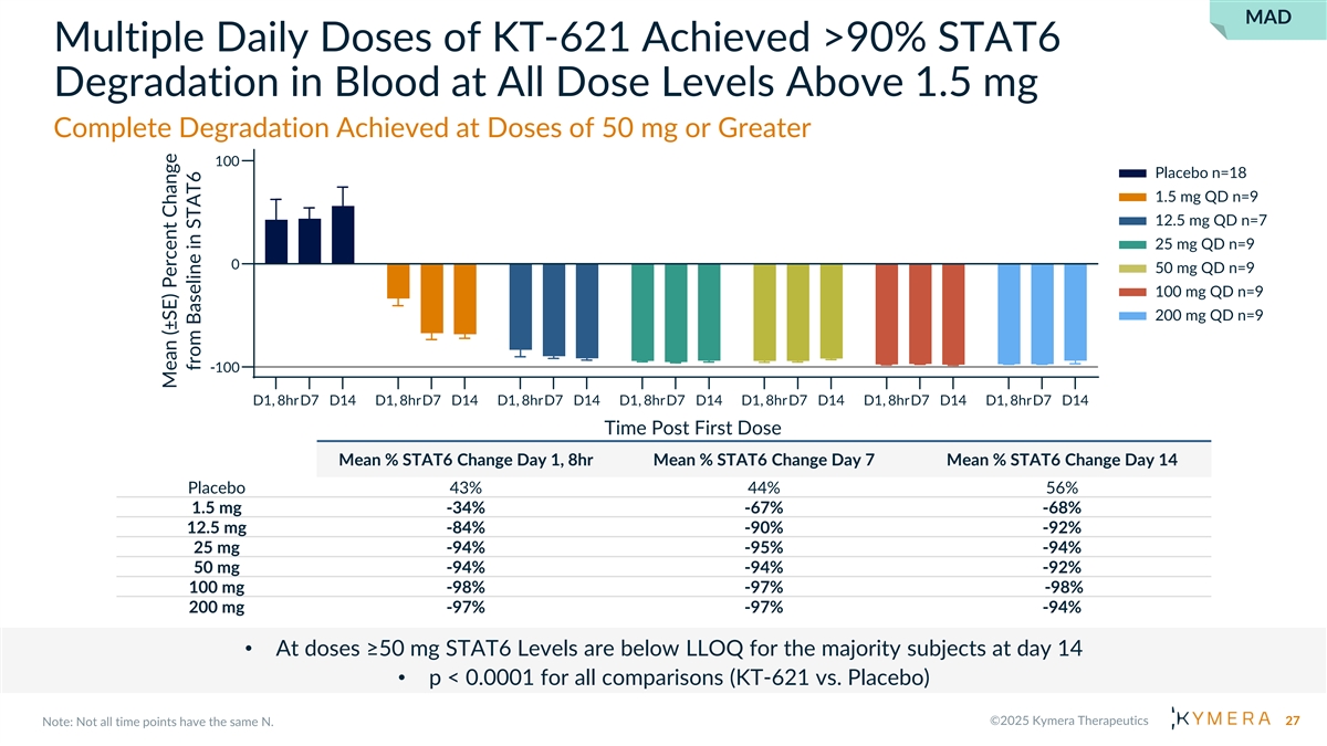 MAD Multiple Daily Doses of KT-621 Rapidly (8hr) Achieved Complete STAT6 Degradation in Blood 1 Mean Absolute STAT6 Levels Mean Percent Change from Baseline in STAT6 200 Placebo n=18 Placebo n=18 150 1.5 mg QD n=9 1.5 mg QD n=9 100 12.5 mg QD n=7 12.5 mg QD n=7 1.0 50 25 mg QD n=9 25 mg QD n=9 0 50 mg QD n=9 0 50 mg QD n=9 100 mg QD n=9 100 mg QD n=9 200 mg QD n=9 200 mg QD n=9 0.5 -100 LLOQ* 0.0 0 hr 8hr 24hr D4 D7 D14 D18 D28 D38 0 hr 8hr 24hr D4 D7 D14 D18 D28 D38 ON TREATMENT ON TREATMENT Time/Day** Time/Day** • Robust STAT6 degradation observed at first time point measured (8hr) for all doses above 1.5 mg • Steady-state maximum degradation achieved as early as 8hr post-first dose with recovery starting at 4 days post-last dose • Most subjects with STAT6 levels below LLOQ at doses of ≥50 mg 26 Mean (±SE) STAT6 (fmol/µg pep) Mean (±SE) Percent Change from Baseline in STAT6