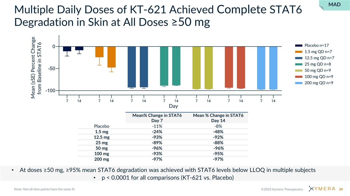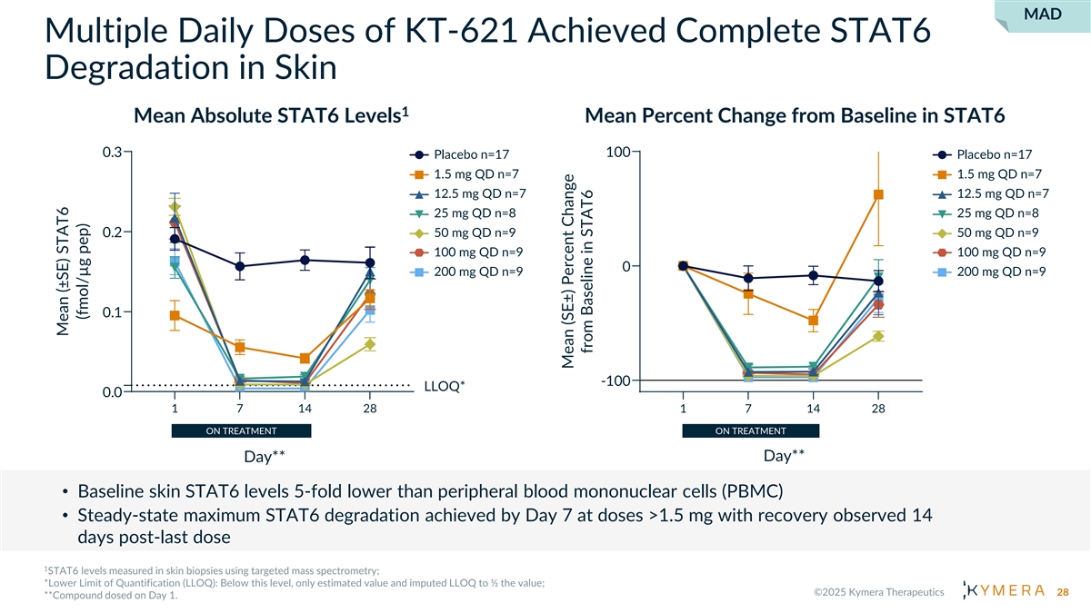 MAD Multiple Daily Doses of KT-621 Achieved >90% STAT6 Degradation in Blood at All Dose Levels Above 1.5 mg Complete Degradation Achieved at Doses of 50 mg or Greater 100 Placebo n=18 1.5 mg QD n=9 12.5 mg QD n=7 25 mg QD n=9 0 50 mg QD n=9 100 mg QD n=9 200 mg QD n=9 -100 D1, 8hrD7 D14 D1, 8hrD7 D14 D1, 8hrD7 D14 D1, 8hrD7 D14 D1, 8hrD7 D14 D1, 8hrD7 D14 D1, 8hrD7 D14 Time Post First Dose Mean % STAT6 Change Day 1, 8hr Mean % STAT6 Change Day 7 Mean % STAT6 Change Day 14 Placebo 43% 44% 56% 1.5 mg -34% -67% -68% 12.5 mg -84% -90% -92% 25 mg -94% -95% -94% 50 mg -94% -94% -92% 100 mg -98% -97% -98% 200 mg -97% -97% -94% • At doses ≥50 mg STAT6 Levels are below LLOQ for the majority subjects at day 14 • p < 0.0001 for all comparisons (KT-621 vs. Placebo) 27 Mean (±SE) Percent Change from Baseline in STAT6