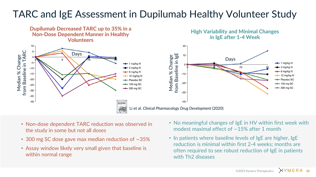TARC and IgE Assessment in Dupilumab Healthy Volunteer Study Dupilumab Decreased TARC up to 35% in a High Variability and Minimal Changes Non-Dose Dependent Manner in Healthy in IgE after 1-4 Week Volunteers Days Days Li et al. Clinical Pharmacology Drug Development (2020) • No meaningful changes of IgE in HV within first week with • Non-dose dependent TARC reduction was observed in modest maximal effect of ∼15% after 1 month the study in some but not all doses • In patients where baseline levels of IgE are higher, IgE • 300 mg SC dose gave max median reduction of ∼35% reduction is minimal within first 2-4 weeks; months are • Assay window likely very small given that baseline is often required to see robust reduction of IgE in patients within normal range with Th2 diseases 32 Median % Change from Baseline in TARC Median % Change from Baseline in IgE