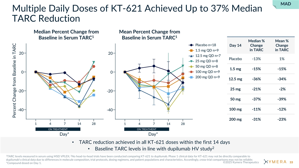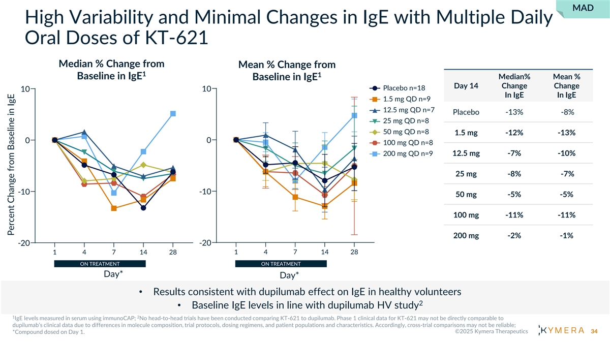 MAD Multiple Daily Doses of KT-621 Achieved Up to 37% Median TARC Reduction Median Percent Change from Mean Percent Change from 1 1 Baseline in Serum TARC Baseline in Serum TARC Median % Mean % Placebo n=18 Day 14 Change Change in TARC in TARC 1.5 mg QD n=9 20 20 12.5 mg QD n=7 Placebo -13% 1% 25 mg QD n=8 50 mg QD n=8 1.5 mg -15% -15% 100 mg QD n=9 0 0 200 mg QD n=9 12.5 mg -36% -34% 25 mg -21% -2% -20 -20 50 mg -37% -39% 100 mg -11% -12% -40 -40 200 mg -31% -23% 1 4 7 14 28 1 4 7 14 28 ON TREATMENT ON TREATMENT Day* Day* • TARC reduction achieved in all KT-621 doses within the first 14 days 2 • Baseline TARC levels in line with dupilumab HV study 33 Percent Change from Baseline in TARC