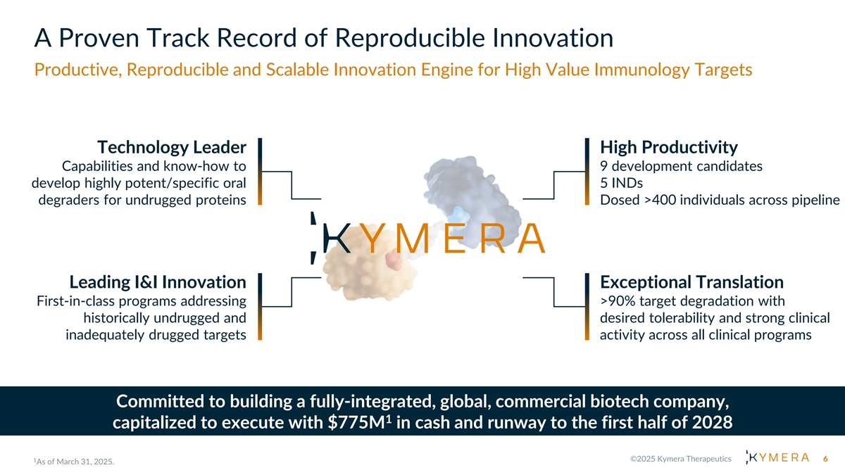 Kymera: Revolutionizing Immunology with Oral Medicines • Targeted Protein Degradation (TPD) leader • Best-in-industry capabilities in hit finding and optimization of oral degraders • Unique target selection strategy pursuing traditionally undrugged targets in highly validated pathways • Portfolio poised to disrupt conventional treatment paradigms By combining the “right target” with the disruptive potential of TPD, Kymera is delivering oral therapies with biologics-like profiles for the first time in industry with the potential to expand access to millions of patients around the world 5