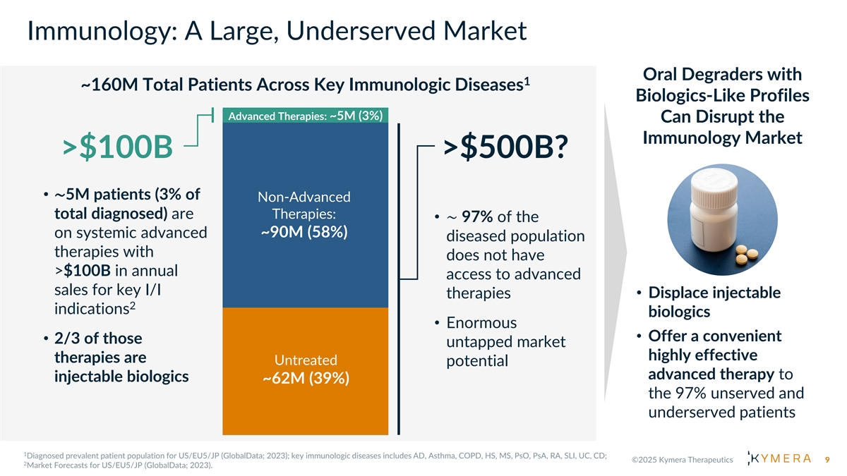 Building a Best-In-Industry Oral Immunology Pipeline Potential Upcoming 2025 1H 2026 Indications Milestones Immunology – Oral Small Molecule Degraders Phase 1 Healthy Volunteer Results AD, Asthma, Ph2b AD Ph1b AD Data: 4Q25 COPD, PN, STAT6 Ph1 HV Ph1b AD Ph2b AD Start: 4Q25 CRSwNP, EoE, KT-621 Ph2b Asthma Ph2b Asthma Start: 1Q26 BP, CSU, others Biomarkers in blood & skin lesions, 28-day efficacy Lupus, IRF5 Ph1 Start: Early 2026 IND Enabling Ph1 Sjögren's, RA, KT-579 IBD, SSc, DM, Program & data disclosure IND Safety, degradation others Partnered with Sanofi/Kymera Opt-In Potential Ph2b HS Ph2b Completion: HS, AD, RA, IRAK4 HS: 1H26 Asthma, 1 2 AD: Mid-2026 KT-474 IBD, others Ph2b AD 8