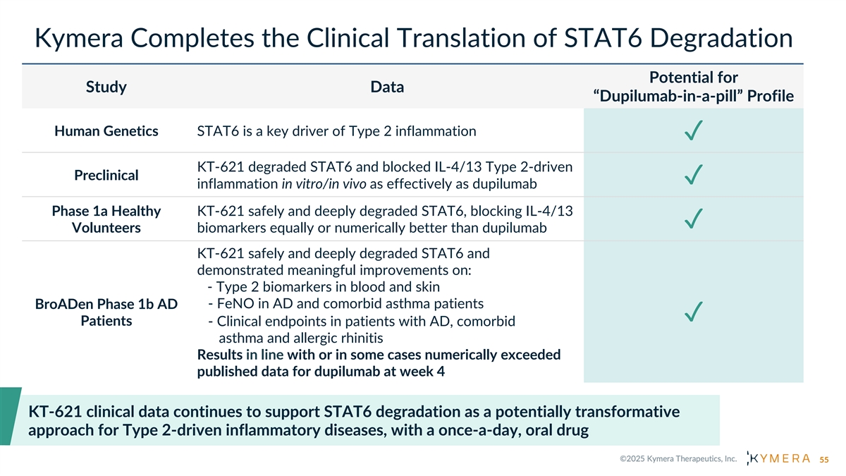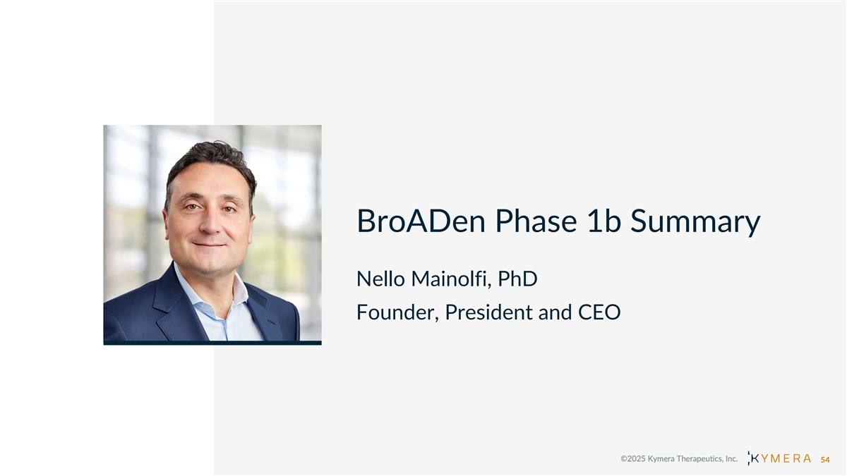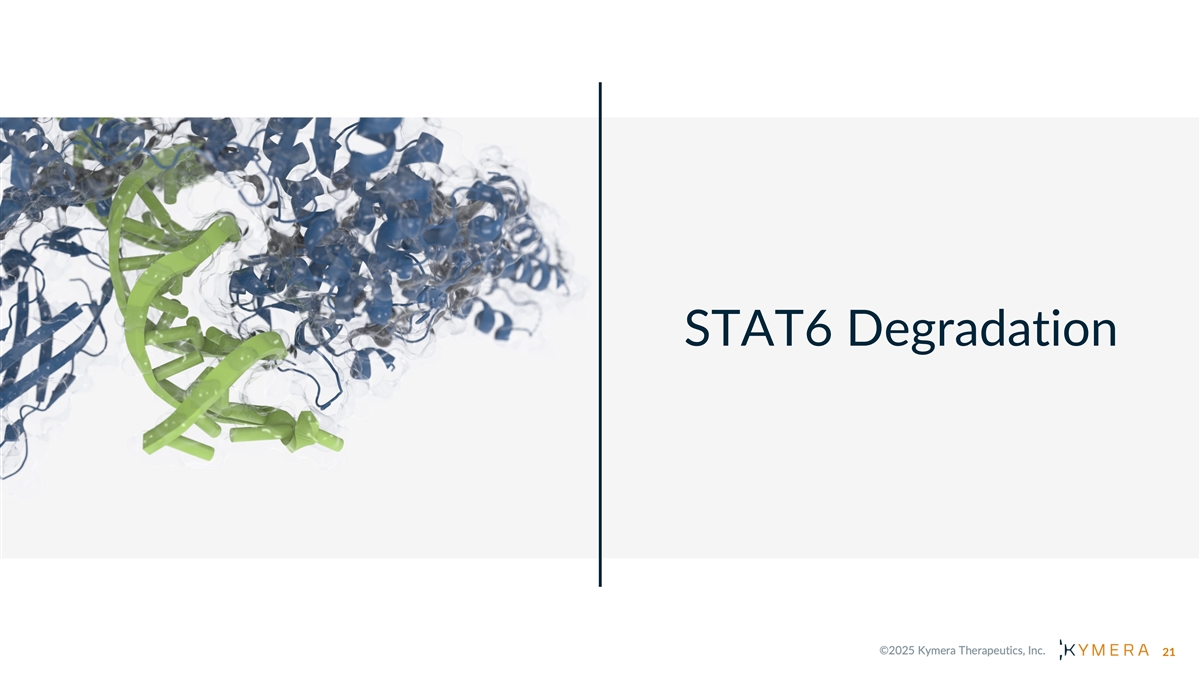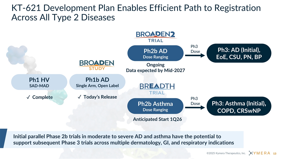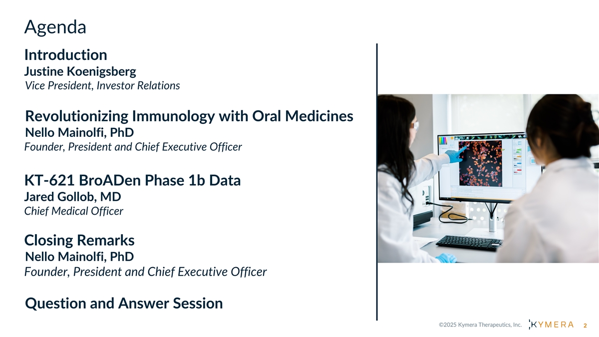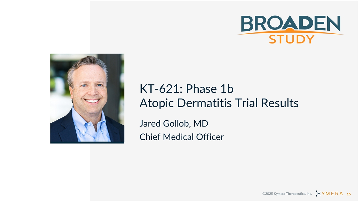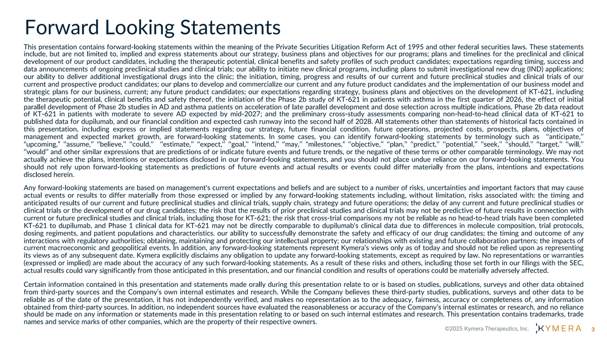 Forward Looking Statements This presentation contains forward-looking statements within the meaning of the Private Securities Litigation Reform Act of 1995 and other federal securities laws. These statements include, but are not limited to, implied and express statements about our strategy, business plans and objectives for our programs; plans and timelines for the preclinical and clinical development of our product candidates, including the therapeutic potential, clinical benefits and safety profiles of such product candidates; expectations regarding timing, success and data announcements of ongoing preclinical studies and clinical trials; our ability to initiate new clinical programs, including plans to submit investigational new drug (IND) applications; our ability to deliver additional investigational drugs into the clinic; the initiation, timing, progress and results of our current and future preclinical studies and clinical trials of our current and prospective product candidates; our plans to develop and commercialize our current and any future product candidates and the implementation of our business model and strategic plans for our business, current; any future product candidates; our expectations regarding strategy, business plans and objectives on the development of KT-621, including the therapeutic potential, clinical benefits and safety thereof, the initiation of the Phase 2b study of KT-621 in patients with asthma in the first quarter of 2026, the effect of initial parallel development of Phase 2b studies in AD and asthma patients on acceleration of late parallel development and dose selection across multiple indications, Phase 2b data readout of KT-621 in patients with moderate to severe AD expected by mid-2027; and the preliminary cross-study assessments comparing non-head-to-head clinical data of KT-621 to published data for dupilumab, and our financial condition and expected cash runway into the second half of 2028. All statements other than statements of historical facts contained in this presentation, including express or implied statements regarding our strategy, future financial condition, future operations, projected costs, prospects, plans, objectives of management and expected market growth, are forward-looking statements. In some cases, you can identify forward-looking statements by terminology such as ‘‘anticipate,’’ “upcoming,” ‘‘assume,’’ ‘‘believe,’’ ‘‘could,’’ ‘‘estimate,’’ ‘‘expect,’’ ‘‘goal,’’ ‘‘intend,’’ ‘‘may,’’ “milestones,” ‘‘objective,’’ ‘‘plan,’’ ‘‘predict,’’ ‘‘potential,’’ ‘‘seek,’’ ‘‘should,’’ ‘‘target,’’ ‘‘will,’’ ‘‘would’’ and other similar expressions that are predictions of or indicate future events and future trends, or the negative of these terms or other comparable terminology. We may not actually achieve the plans, intentions or expectations disclosed in our forward-looking statements, and you should not place undue reliance on our forward-looking statements. You should not rely upon forward-looking statements as predictions of future events and actual results or events could differ materially from the plans, intentions and expectations disclosed herein. Any forward-looking statements are based on management's current expectations and beliefs and are subject to a number of risks, uncertainties and important factors that may cause actual events or results to differ materially from those expressed or implied by any forward-looking statements including, without limitation, risks associated with: the timing and anticipated results of our current and future preclinical studies and clinical trials, supply chain, strategy and future operations; the delay of any current and future preclinical studies or clinical trials or the development of our drug candidates; the risk that the results of prior preclinical studies and clinical trials may not be predictive of future results in connection with current or future preclinical studies and clinical trials, including those for KT-621; the risk that cross-trial comparisons my not be reliable as no head-to-head trials have been completed KT-621 to dupilumab, and Phase 1 clinical data for KT-621 may not be directly comparable to dupilumab's clinical data due to differences in molecule composition, trial protocols, dosing regiments, and patient populations and characteristics. our ability to successfully demonstrate the safety and efficacy of our drug candidates; the timing and outcome of any interactions with regulatory authorities; obtaining, maintaining and protecting our intellectual property; our relationships with existing and future collaboration partners; the impacts of current macroeconomic and geopolitical events. In addition, any forward-looking statements represent Kymera’s views only as of today and should not be relied upon as representing its views as of any subsequent date. Kymera explicitly disclaims any obligation to update any forward-looking statements, except as required by law. No representations or warranties (expressed or implied) are made about the accuracy of any such forward-looking statements. As a result of these risks and others, including those set forth in our filings with the SEC, actual results could vary significantly from those anticipated in this presentation, and our financial condition and results of operations could be materially adversely affected. Certain information contained in this presentation and statements made orally during this presentation relate to or is based on studies, publications, surveys and other data obtained from third-party sources and the Company’s own internal estimates and research. While the Company believes these third-party studies, publications, surveys and other data to be reliable as of the date of the presentation, it has not independently verified, and makes no representation as to 