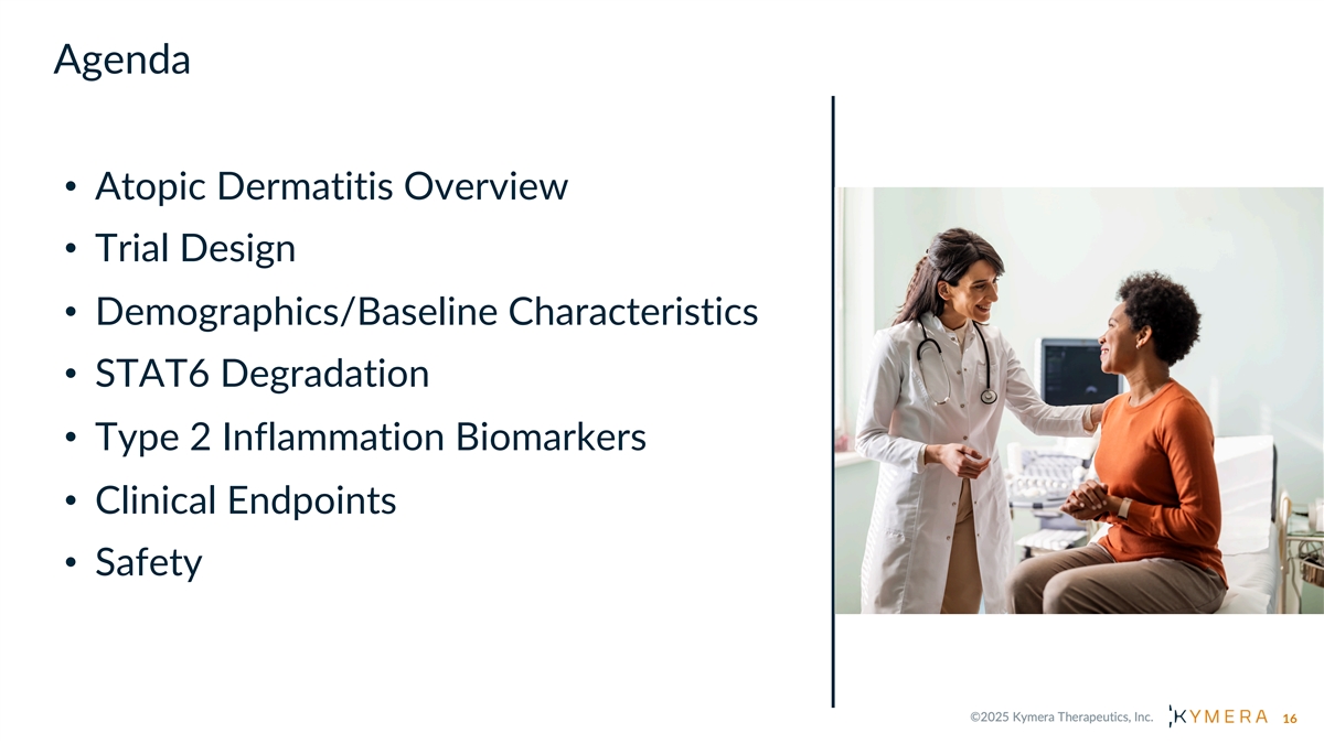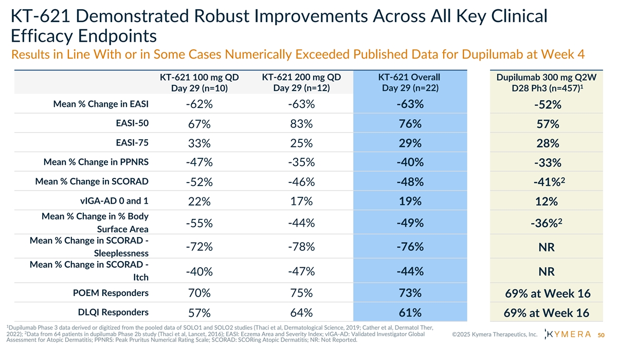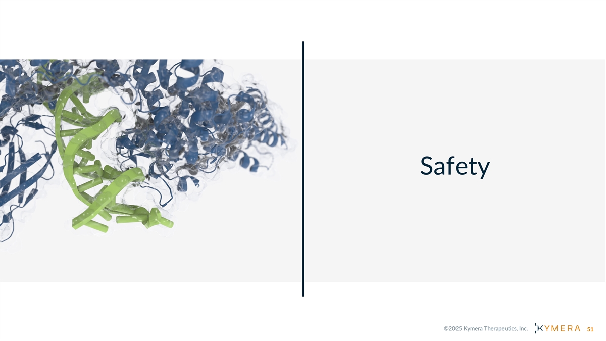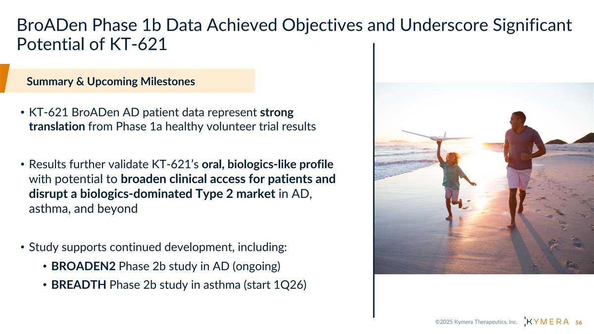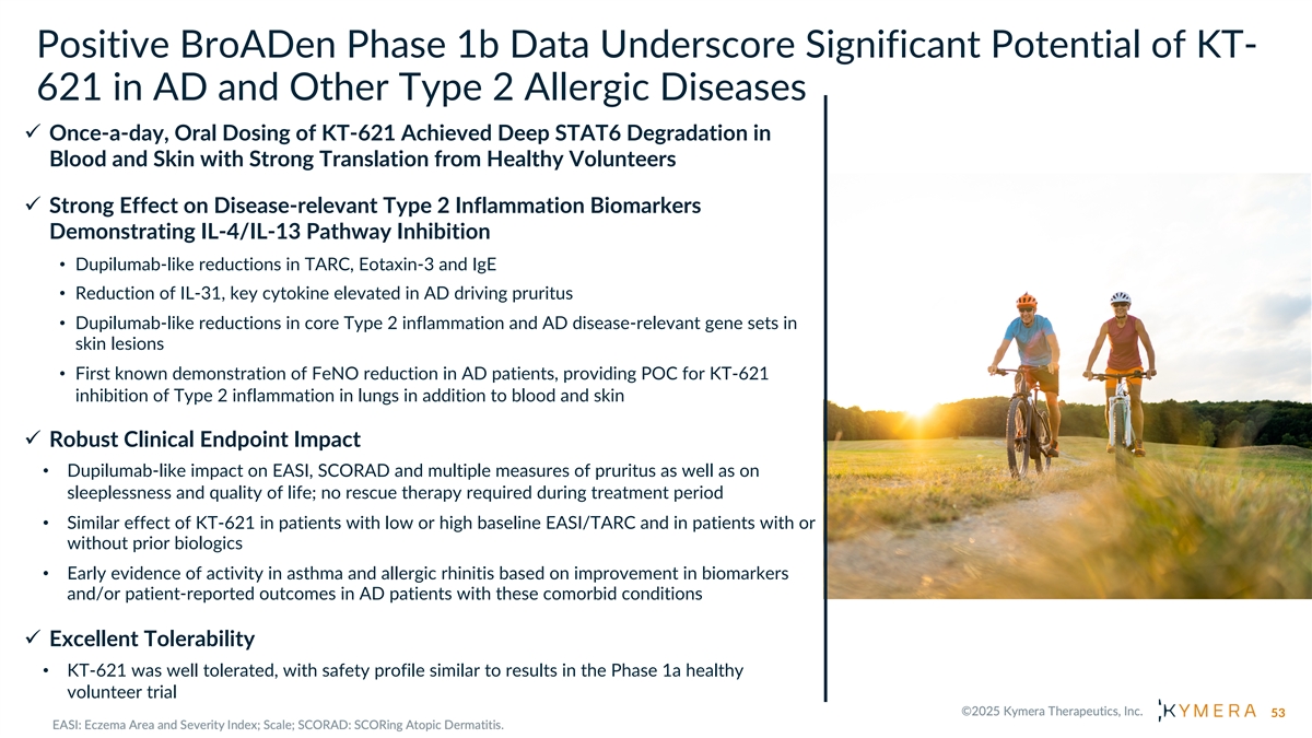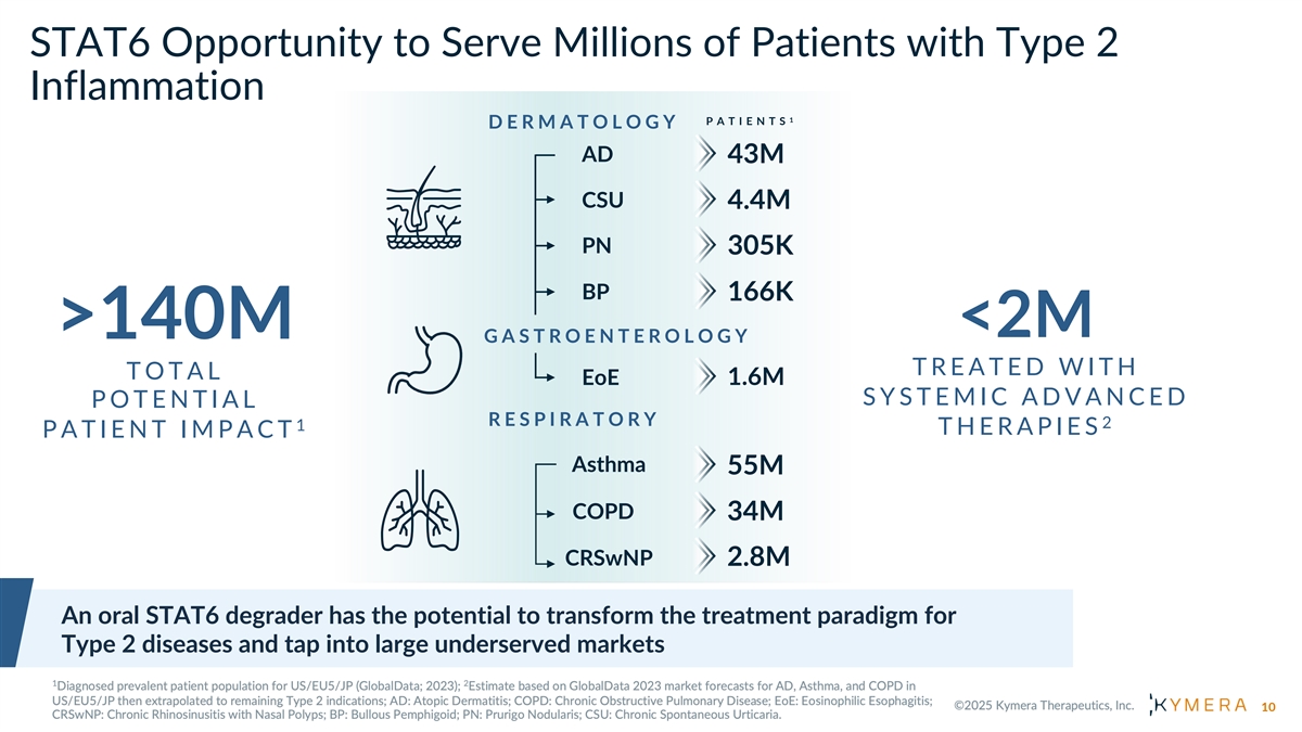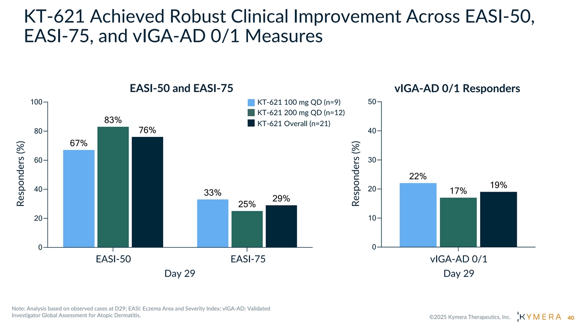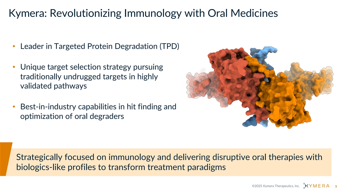 Forward Looking Statements This presentation contains forward-looking statements within the meaning of the Private Securities Litigation Reform Act of 1995 and other federal securities laws. These statements include, but are not limited to, implied and express statements about our strategy, business plans and objectives for our programs; plans and timelines for the preclinical and clinical development of our product candidates, including the therapeutic potential, clinical benefits and safety profiles of such product candidates; expectations regarding timing, success and data announcements of ongoing preclinical studies and clinical trials; our ability to initiate new clinical programs, including plans to submit investigational new drug (IND) applications; our ability to deliver additional investigational drugs into the clinic; the initiation, timing, progress and results of our current and future preclinical studies and clinical trials of our current and prospective product candidates; our plans to develop and commercialize our current and any future product candidates and the implementation of our business model and strategic plans for our business, current; any future product candidates; our expectations regarding strategy, business plans and objectives on the development of KT-621, including the therapeutic potential, clinical benefits and safety thereof, the initiation of the Phase 2b study of KT-621 in patients with asthma in the first quarter of 2026, the effect of initial parallel development of Phase 2b studies in AD and asthma patients on acceleration of late parallel development and dose selection across multiple indications, Phase 2b data readout of KT-621 in patients with moderate to severe AD expected by mid-2027; and the preliminary cross-study assessments comparing non-head-to-head clinical data of KT-621 to published data for dupilumab, and our financial condition and expected cash runway into the second half of 2028. All statements other than statements of historical facts contained in this presentation, including express or implied statements regarding our strategy, future financial condition, future operations, projected costs, prospects, plans, objectives of management and expected market growth, are forward-looking statements. In some cases, you can identify forward-looking statements by terminology such as ‘‘anticipate,’’ “upcoming,” ‘‘assume,’’ ‘‘believe,’’ ‘‘could,’’ ‘‘estimate,’’ ‘‘expect,’’ ‘‘goal,’’ ‘‘intend,’’ ‘‘may,’’ “milestones,” ‘‘objective,’’ ‘‘plan,’’ ‘‘predict,’’ ‘‘potential,’’ ‘‘seek,’’ ‘‘should,’’ ‘‘target,’’ ‘‘will,’’ ‘‘would’’ and other similar expressions that are predictions of or indicate future events and future trends, or the negative of these terms or other comparable terminology. We may not actually achieve the plans, intentions or expectations disclosed in our forward-looking statements, and you should not place undue reliance on our forward-looking statements. You should not rely upon forward-looking statements as predictions of future events and actual results or events could differ materially from the plans, intentions and expectations disclosed herein. Any forward-looking statements are based on management's current expectations and beliefs and are subject to a number of risks, uncertainties and important factors that may cause actual events or results to differ materially from those expressed or implied by any forward-looking statements including, without limitation, risks associated with: the timing and anticipated results of our current and future preclinical studies and clinical trials, supply chain, strategy and future operations; the delay of any current and future preclinical studies or clinical trials or the development of our drug candidates; the risk that the results of prior preclinical studies and clinical trials may not be predictive of future results in connection with current or future preclinical studies and clinical trials, including those for KT-621; the risk that cross-trial comparisons my not be reliable as no head-to-head trials have been completed KT-621 to dupilumab, and Phase 1 clinical data for KT-621 may not be directly comparable to dupilumab's clinical data due to differences in molecule composition, trial protocols, dosing regiments, and patient populations and characteristics. our ability to successfully demonstrate the safety and efficacy of our drug candidates; the timing and outcome of any interactions with regulatory authorities; obtaining, maintaining and protecting our intellectual property; our relationships with existing and future collaboration partners; the impacts of current macroeconomic and geopolitical events. In addition, any forward-looking statements represent Kymera’s views only as of today and should not be relied upon as representing its views as of any subsequent date. Kymera explicitly disclaims any obligation to update any forward-looking statements, except as required by law. No representations or warranties (expressed or implied) are made about the accuracy of any such forward-looking statements. As a result of these risks and others, including those set forth in our filings with the SEC, actual results could vary significantly from those anticipated in this presentation, and our financial condition and results of operations could be materially adversely affected. Certain information contained in this presentation and statements made orally during this presentation relate to or is based on studies, publications, surveys and other data obtained from third-party sources and the Company’s own internal estimates and research. While the Company believes these third-party studies, publications, surveys and other data to be reliable as of the date of the presentation, it has not independently verified, and makes no representation as to 