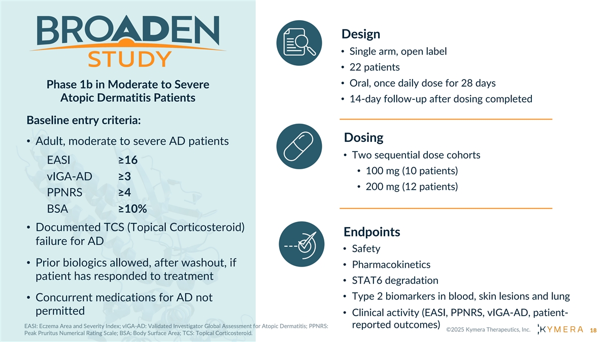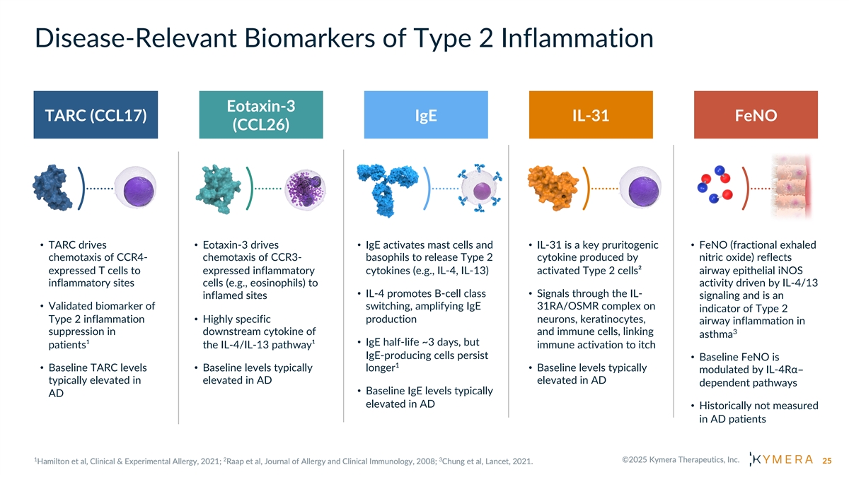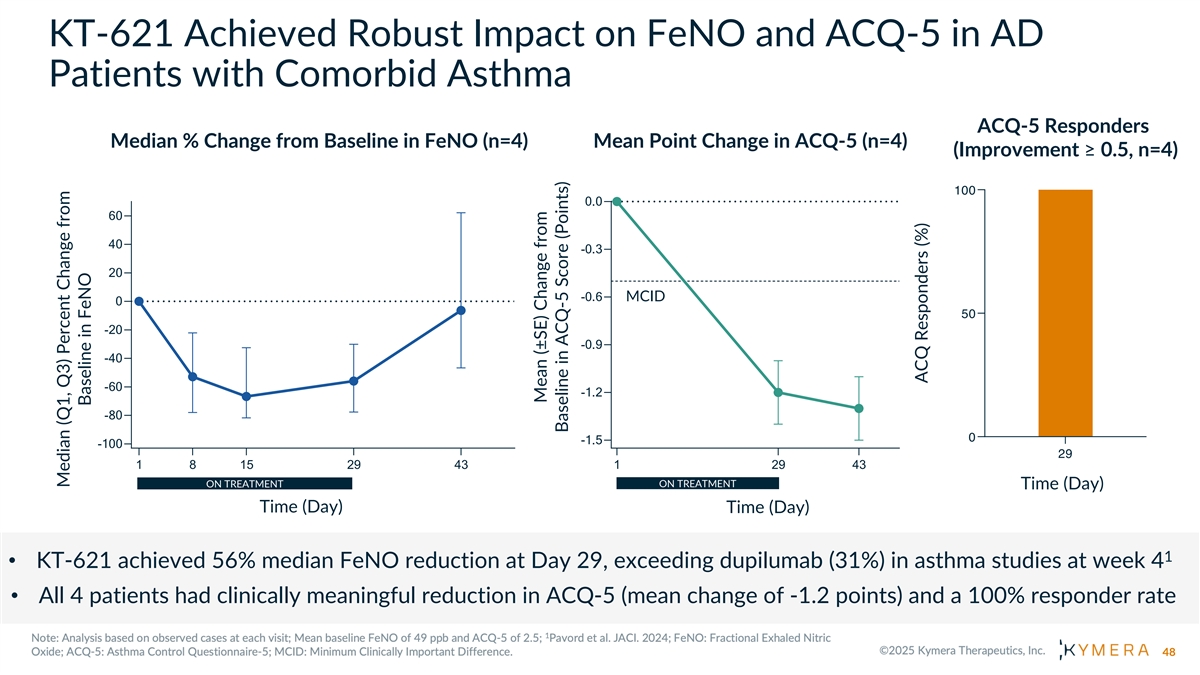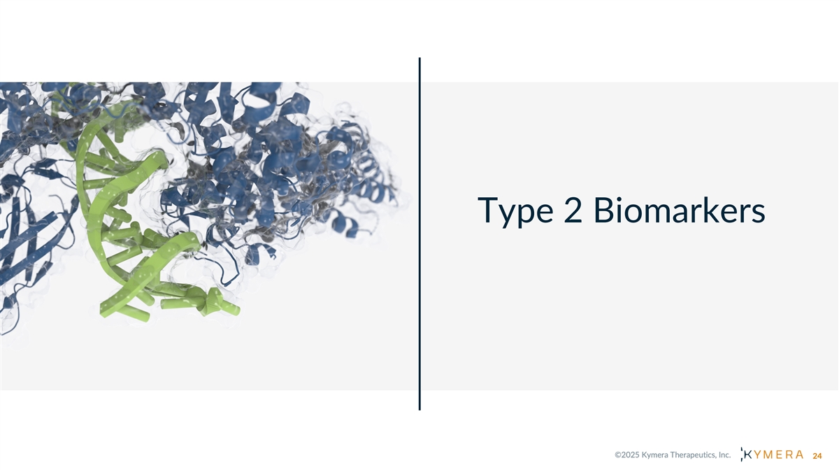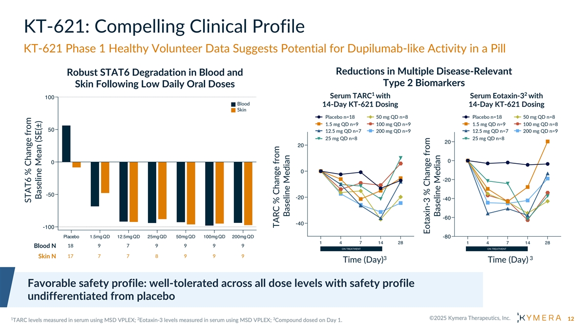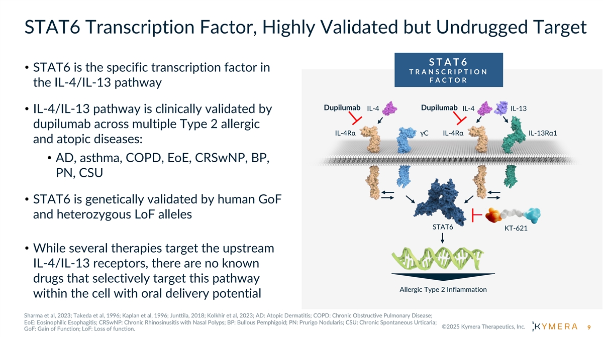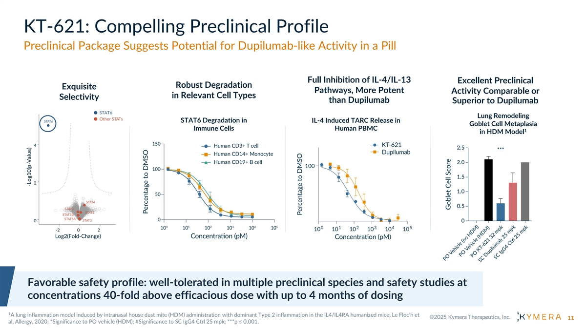 Forward Looking Statements This presentation contains forward-looking statements within the meaning of the Private Securities Litigation Reform Act of 1995 and other federal securities laws. These statements include, but are not limited to, implied and express statements about our strategy, business plans and objectives for our programs; plans and timelines for the preclinical and clinical development of our product candidates, including the therapeutic potential, clinical benefits and safety profiles of such product candidates; expectations regarding timing, success and data announcements of ongoing preclinical studies and clinical trials; our ability to initiate new clinical programs, including plans to submit investigational new drug (IND) applications; our ability to deliver additional investigational drugs into the clinic; the initiation, timing, progress and results of our current and future preclinical studies and clinical trials of our current and prospective product candidates; our plans to develop and commercialize our current and any future product candidates and the implementation of our business model and strategic plans for our business, current; any future product candidates; our expectations regarding strategy, business plans and objectives on the development of KT-621, including the therapeutic potential, clinical benefits and safety thereof, the initiation of the Phase 2b study of KT-621 in patients with asthma in the first quarter of 2026, the effect of initial parallel development of Phase 2b studies in AD and asthma patients on acceleration of late parallel development and dose selection across multiple indications, Phase 2b data readout of KT-621 in patients with moderate to severe AD expected by mid-2027; and the preliminary cross-study assessments comparing non-head-to-head clinical data of KT-621 to published data for dupilumab, and our financial condition and expected cash runway into the second half of 2028. All statements other than statements of historical facts contained in this presentation, including express or implied statements regarding our strategy, future financial condition, future operations, projected costs, prospects, plans, objectives of management and expected market growth, are forward-looking statements. In some cases, you can identify forward-looking statements by terminology such as ‘‘anticipate,’’ “upcoming,” ‘‘assume,’’ ‘‘believe,’’ ‘‘could,’’ ‘‘estimate,’’ ‘‘expect,’’ ‘‘goal,’’ ‘‘intend,’’ ‘‘may,’’ “milestones,” ‘‘objective,’’ ‘‘plan,’’ ‘‘predict,’’ ‘‘potential,’’ ‘‘seek,’’ ‘‘should,’’ ‘‘target,’’ ‘‘will,’’ ‘‘would’’ and other similar expressions that are predictions of or indicate future events and future trends, or the negative of these terms or other comparable terminology. We may not actually achieve the plans, intentions or expectations disclosed in our forward-looking statements, and you should not place undue reliance on our forward-looking statements. You should not rely upon forward-looking statements as predictions of future events and actual results or events could differ materially from the plans, intentions and expectations disclosed herein. Any forward-looking statements are based on management's current expectations and beliefs and are subject to a number of risks, uncertainties and important factors that may cause actual events or results to differ materially from those expressed or implied by any forward-looking statements including, without limitation, risks associated with: the timing and anticipated results of our current and future preclinical studies and clinical trials, supply chain, strategy and future operations; the delay of any current and future preclinical studies or clinical trials or the development of our drug candidates; the risk that the results of prior preclinical studies and clinical trials may not be predictive of future results in connection with current or future preclinical studies and clinical trials, including those for KT-621; the risk that cross-trial comparisons my not be reliable as no head-to-head trials have been completed KT-621 to dupilumab, and Phase 1 clinical data for KT-621 may not be directly comparable to dupilumab's clinical data due to differences in molecule composition, trial protocols, dosing regiments, and patient populations and characteristics. our ability to successfully demonstrate the safety and efficacy of our drug candidates; the timing and outcome of any interactions with regulatory authorities; obtaining, maintaining and protecting our intellectual property; our relationships with existing and future collaboration partners; the impacts of current macroeconomic and geopolitical events. In addition, any forward-looking statements represent Kymera’s views only as of today and should not be relied upon as representing its views as of any subsequent date. Kymera explicitly disclaims any obligation to update any forward-looking statements, except as required by law. No representations or warranties (expressed or implied) are made about the accuracy of any such forward-looking statements. As a result of these risks and others, including those set forth in our filings with the SEC, actual results could vary significantly from those anticipated in this presentation, and our financial condition and results of operations could be materially adversely affected. Certain information contained in this presentation and statements made orally during this presentation relate to or is based on studies, publications, surveys and other data obtained from third-party sources and the Company’s own internal estimates and research. While the Company believes these third-party studies, publications, surveys and other data to be reliable as of the date of the presentation, it has not independently verified, and makes no representation as to 