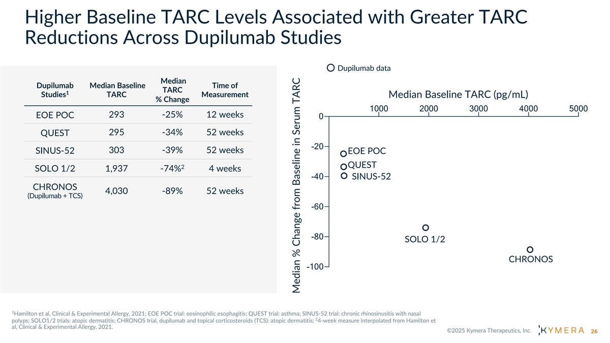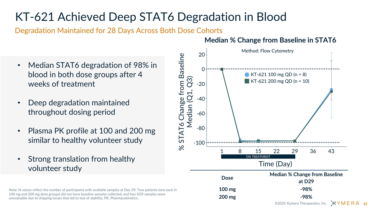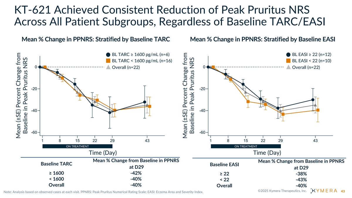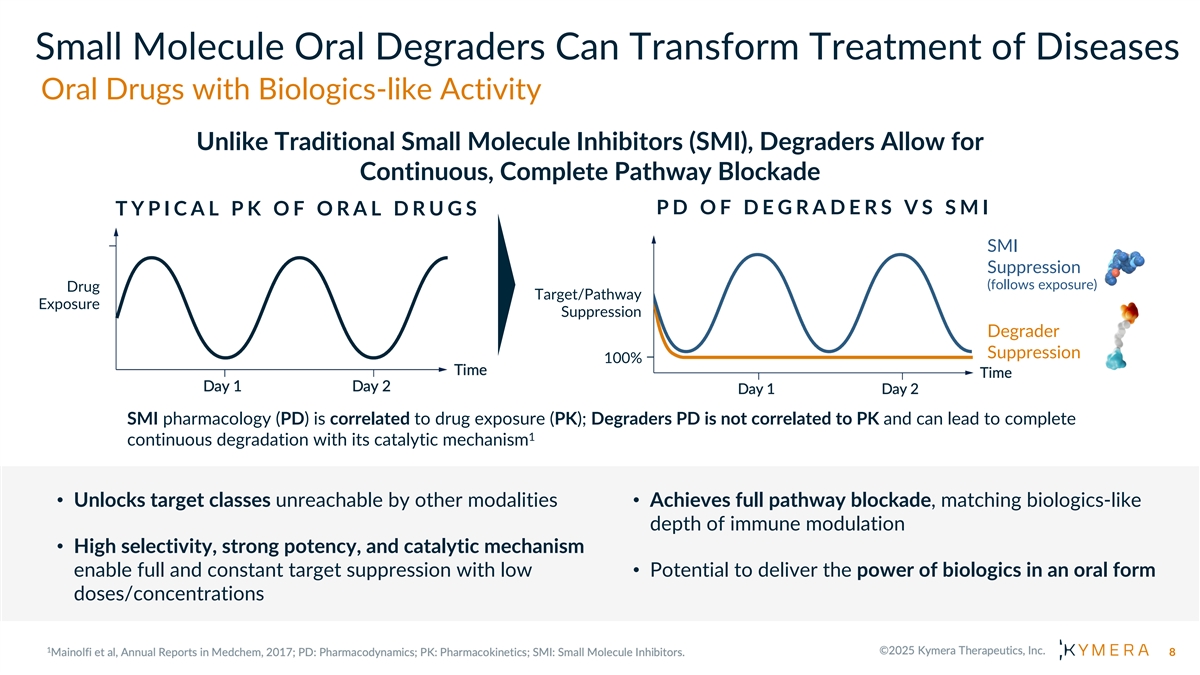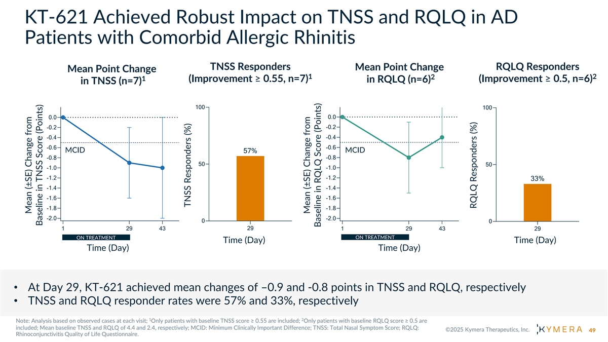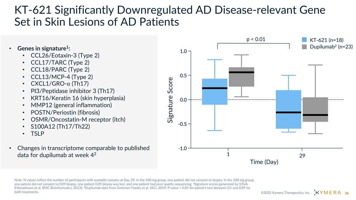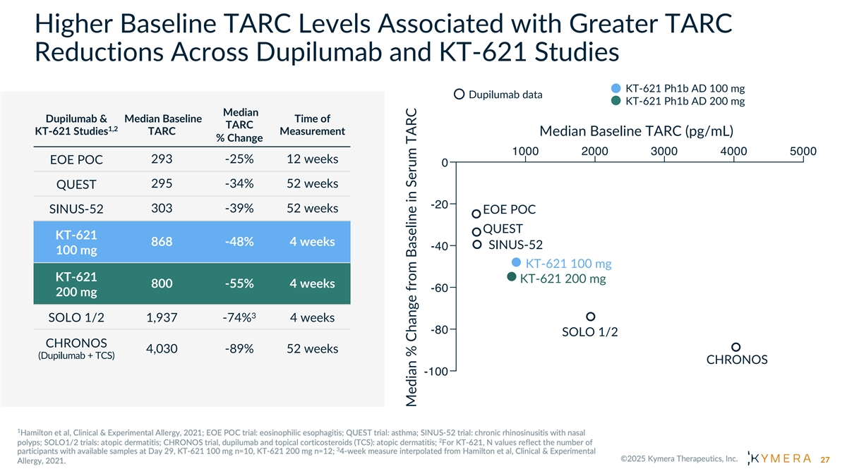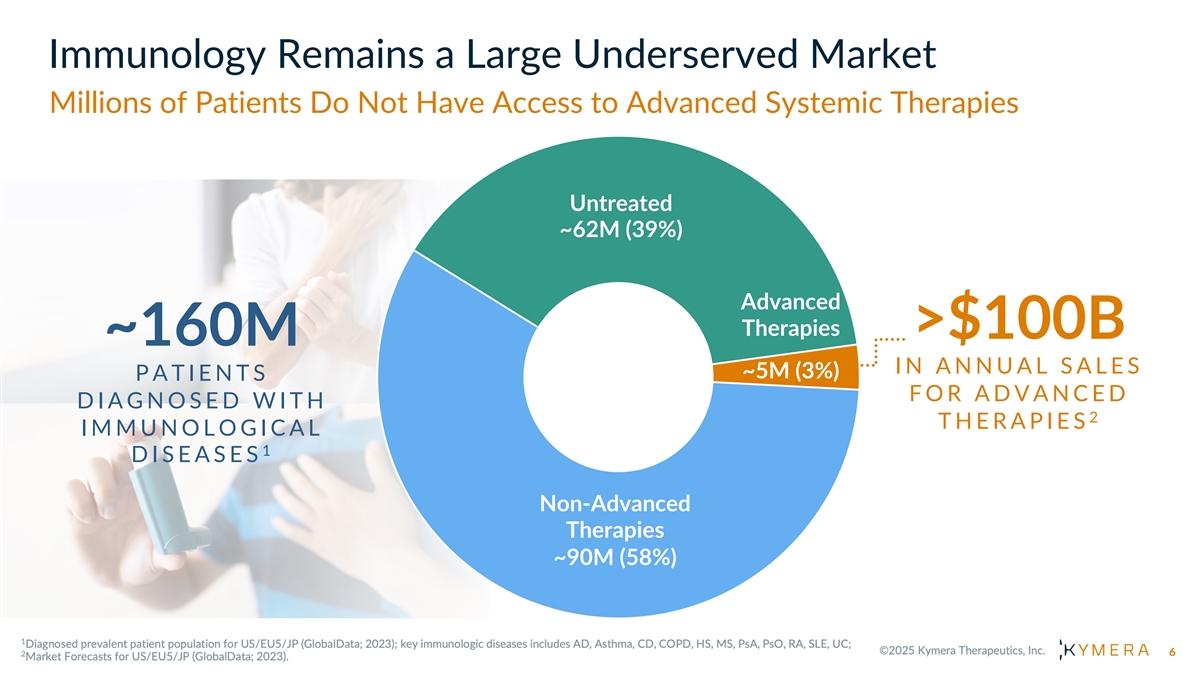 Forward Looking Statements This presentation contains forward-looking statements within the meaning of the Private Securities Litigation Reform Act of 1995 and other federal securities laws. These statements include, but are not limited to, implied and express statements about our strategy, business plans and objectives for our programs; plans and timelines for the preclinical and clinical development of our product candidates, including the therapeutic potential, clinical benefits and safety profiles of such product candidates; expectations regarding timing, success and data announcements of ongoing preclinical studies and clinical trials; our ability to initiate new clinical programs, including plans to submit investigational new drug (IND) applications; our ability to deliver additional investigational drugs into the clinic; the initiation, timing, progress and results of our current and future preclinical studies and clinical trials of our current and prospective product candidates; our plans to develop and commercialize our current and any future product candidates and the implementation of our business model and strategic plans for our business, current; any future product candidates; our expectations regarding strategy, business plans and objectives on the development of KT-621, including the therapeutic potential, clinical benefits and safety thereof, the initiation of the Phase 2b study of KT-621 in patients with asthma in the first quarter of 2026, the effect of initial parallel development of Phase 2b studies in AD and asthma patients on acceleration of late parallel development and dose selection across multiple indications, Phase 2b data readout of KT-621 in patients with moderate to severe AD expected by mid-2027; and the preliminary cross-study assessments comparing non-head-to-head clinical data of KT-621 to published data for dupilumab, and our financial condition and expected cash runway into the second half of 2028. All statements other than statements of historical facts contained in this presentation, including express or implied statements regarding our strategy, future financial condition, future operations, projected costs, prospects, plans, objectives of management and expected market growth, are forward-looking statements. In some cases, you can identify forward-looking statements by terminology such as ‘‘anticipate,’’ “upcoming,” ‘‘assume,’’ ‘‘believe,’’ ‘‘could,’’ ‘‘estimate,’’ ‘‘expect,’’ ‘‘goal,’’ ‘‘intend,’’ ‘‘may,’’ “milestones,” ‘‘objective,’’ ‘‘plan,’’ ‘‘predict,’’ ‘‘potential,’’ ‘‘seek,’’ ‘‘should,’’ ‘‘target,’’ ‘‘will,’’ ‘‘would’’ and other similar expressions that are predictions of or indicate future events and future trends, or the negative of these terms or other comparable terminology. We may not actually achieve the plans, intentions or expectations disclosed in our forward-looking statements, and you should not place undue reliance on our forward-looking statements. You should not rely upon forward-looking statements as predictions of future events and actual results or events could differ materially from the plans, intentions and expectations disclosed herein. Any forward-looking statements are based on management's current expectations and beliefs and are subject to a number of risks, uncertainties and important factors that may cause actual events or results to differ materially from those expressed or implied by any forward-looking statements including, without limitation, risks associated with: the timing and anticipated results of our current and future preclinical studies and clinical trials, supply chain, strategy and future operations; the delay of any current and future preclinical studies or clinical trials or the development of our drug candidates; the risk that the results of prior preclinical studies and clinical trials may not be predictive of future results in connection with current or future preclinical studies and clinical trials, including those for KT-621; the risk that cross-trial comparisons my not be reliable as no head-to-head trials have been completed KT-621 to dupilumab, and Phase 1 clinical data for KT-621 may not be directly comparable to dupilumab's clinical data due to differences in molecule composition, trial protocols, dosing regiments, and patient populations and characteristics. our ability to successfully demonstrate the safety and efficacy of our drug candidates; the timing and outcome of any interactions with regulatory authorities; obtaining, maintaining and protecting our intellectual property; our relationships with existing and future collaboration partners; the impacts of current macroeconomic and geopolitical events. In addition, any forward-looking statements represent Kymera’s views only as of today and should not be relied upon as representing its views as of any subsequent date. Kymera explicitly disclaims any obligation to update any forward-looking statements, except as required by law. No representations or warranties (expressed or implied) are made about the accuracy of any such forward-looking statements. As a result of these risks and others, including those set forth in our filings with the SEC, actual results could vary significantly from those anticipated in this presentation, and our financial condition and results of operations could be materially adversely affected. Certain information contained in this presentation and statements made orally during this presentation relate to or is based on studies, publications, surveys and other data obtained from third-party sources and the Company’s own internal estimates and research. While the Company believes these third-party studies, publications, surveys and other data to be reliable as of the date of the presentation, it has not independently verified, and makes no representation as to 