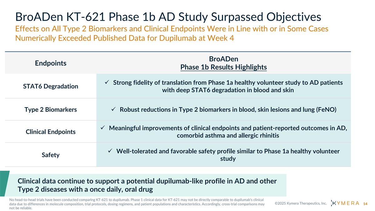KT-621 Development Plan Enables Efficient Path to Registration Across All Type 2 Diseases Ph3 Ph3: AD (Initial), Ph2b AD Dose Dose Ranging EoE, CSU, PN, BP Ongoing Data expected by Mid-2027 Ph1 HV Ph1b AD SAD-MAD Single Arm, Open Label ✓ Today’s Release ✓ Complete Ph3 Dose Ph3: Asthma (Initial), Ph2b Asthma Dose Ranging COPD, CRSwNP Anticipated Start 1Q26 Initial parallel Phase 2b trials in moderate to severe AD and asthma have the potential to support subsequent Phase 3 trials across multiple dermatology, GI, and respiratory indications 13