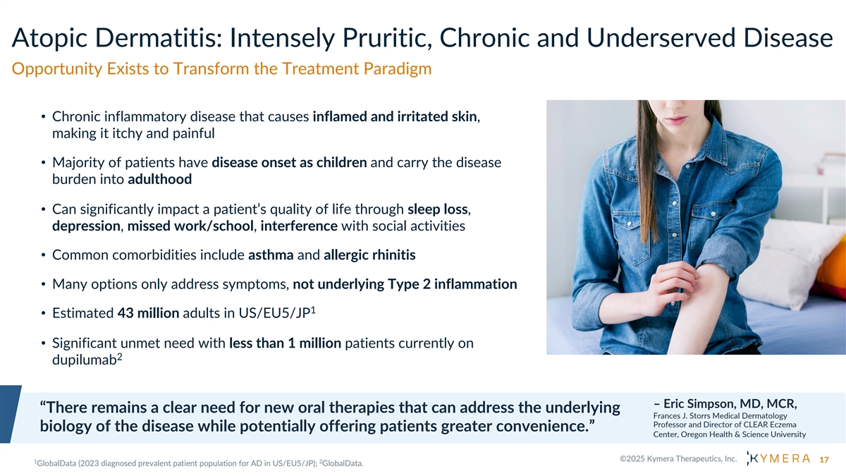 Atopic Dermatitis: Intensely Pruritic, Chronic and Underserved Disease Opportunity Exists to Transform the Treatment Paradigm • Chronic inflammatory disease that causes inflamed and irritated skin, making it itchy and painful • Majority of patients have disease onset as children and carry the disease burden into adulthood • Can significantly impact a patient’s quality of life through sleep loss, depression, missed work/school, interference with social activities • Common comorbidities include asthma and allergic rhinitis • Many options only address symptoms, not underlying Type 2 inflammation 1 • Estimated 43 million adults in US/EU5/JP • Significant unmet need with less than 1 million patients currently on 2 dupilumab – Eric Simpson, MD, MCR, “There remains a clear need for new oral therapies that can address the underlying Frances J. Storrs Medical Dermatology Professor and Director of CLEAR Eczema biology of the disease while potentially offering patients greater convenience.” Center, Oregon Health & Science University 17