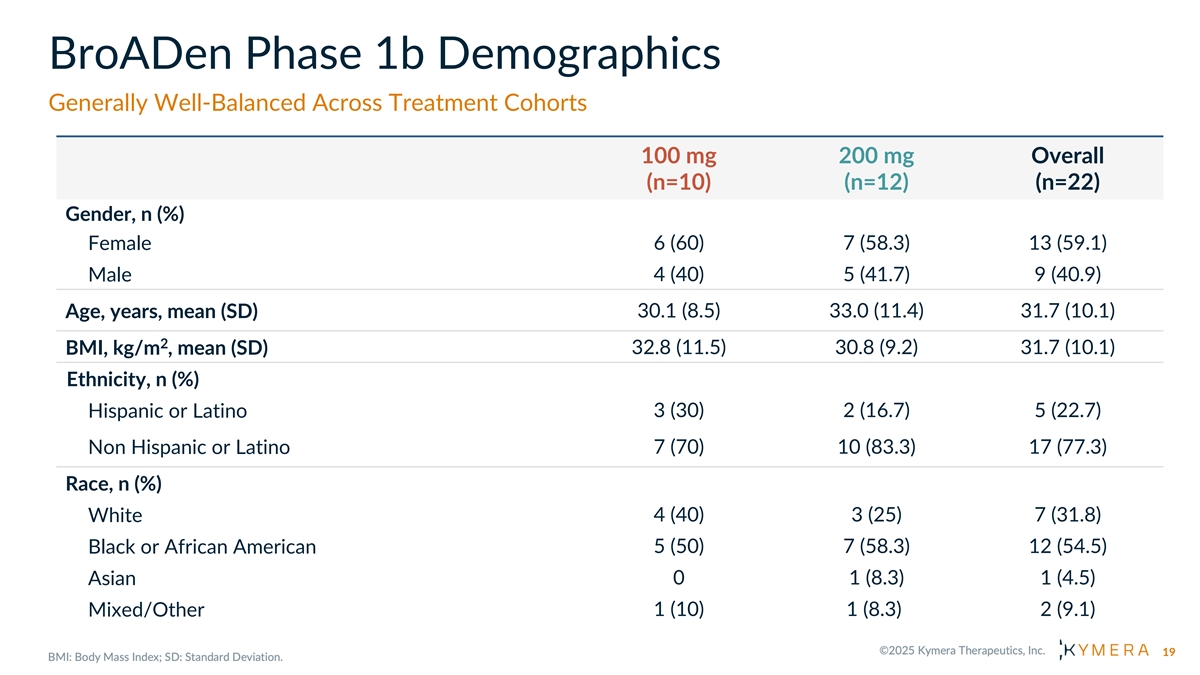 BroADen Phase 1b Demographics Generally Well-Balanced Across Treatment Cohorts 100 mg 200 mg Overall (n=10) (n=12) (n=22) Gender, n (%) Female 6 (60) 7 (58.3) 13 (59.1) Male 4 (40) 5 (41.7) 9 (40.9) 30.1 (8.5) 33.0 (11.4) 31.7 (10.1) Age, years, mean (SD) 2 32.8 (11.5) 30.8 (9.2) 31.7 (10.1) BMI, kg/m , mean (SD) Ethnicity, n (%) Hispanic or Latino 3 (30) 2 (16.7) 5 (22.7) Non Hispanic or Latino 7 (70) 10 (83.3) 17 (77.3) Race, n (%) 4 (40) 3 (25) 7 (31.8) White Black or African American 5 (50) 7 (58.3) 12 (54.5) Asian 0 1 (8.3) 1 (4.5) Mixed/Other 1 (10) 1 (8.3) 2 (9.1) 19