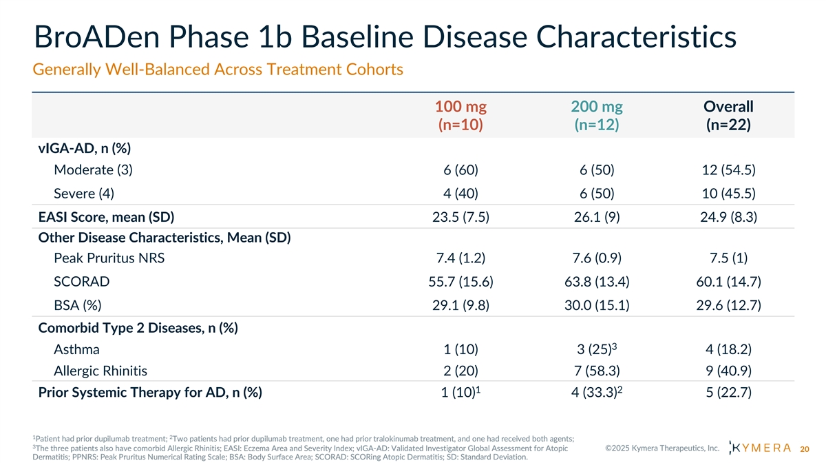 BroADen Phase 1b Baseline Disease Characteristics Generally Well-Balanced Across Treatment Cohorts 100 mg 200 mg Overall (n=10) (n=12) (n=22) vIGA-AD, n (%) Moderate (3) 6 (60) 6 (50) 12 (54.5) Severe (4) 4 (40) 6 (50) 10 (45.5) EASI Score, mean (SD) 23.5 (7.5) 26.1 (9) 24.9 (8.3) Other Disease Characteristics, Mean (SD) Peak Pruritus NRS 7.4 (1.2) 7.6 (0.9) 7.5 (1) SCORAD 55.7 (15.6) 63.8 (13.4) 60.1 (14.7) BSA (%) 29.1 (9.8) 30.0 (15.1) 29.6 (12.7) Comorbid Type 2 Diseases, n (%) 3 Asthma 1 (10) 3 (25) 4 (18.2) Allergic Rhinitis 2 (20) 7 (58.3) 9 (40.9) 1 2 Prior Systemic Therapy for AD, n (%) 1 (10) 4 (33.3) 5 (22.7) 20