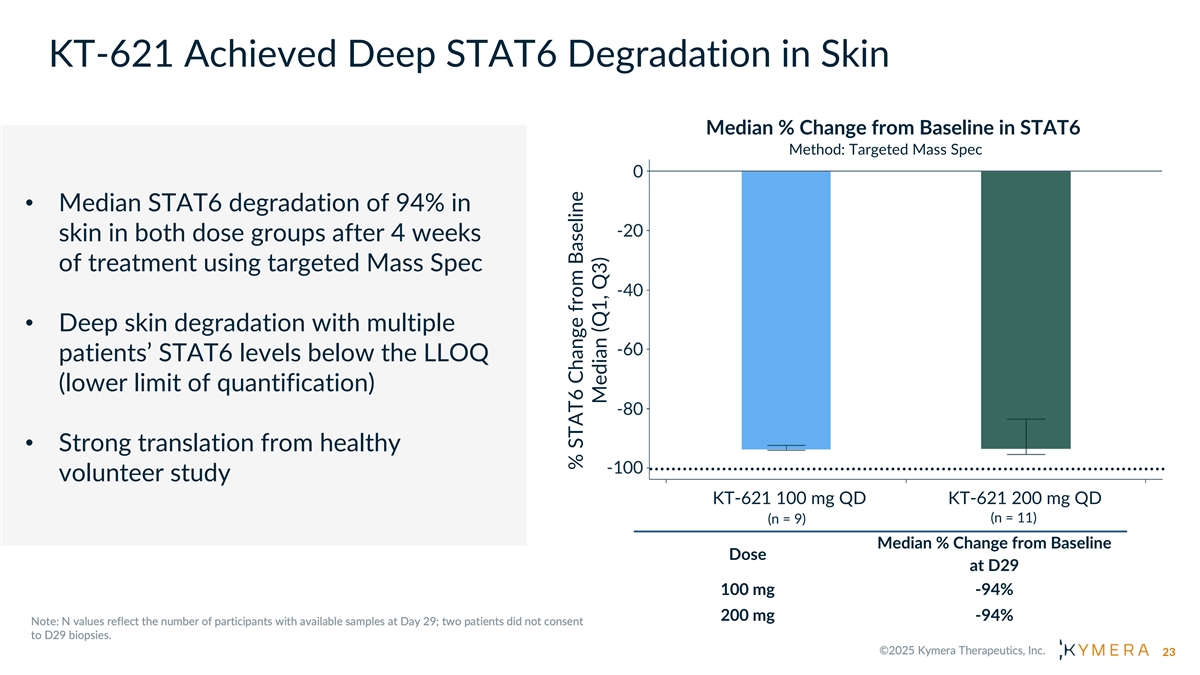 KT-621 Achieved Deep STAT6 Degradation in Blood Degradation Maintained for 28 Days Across Both Dose Cohorts Median % Change from Baseline in STAT6 Method: Flow Cytometry • Median STAT6 degradation of 98% in KT-621 100 mg QD (n = 8) blood in both dose groups after 4 KT-621 200 mg QD (n = 10) weeks of treatment • Deep degradation maintained throughout dosing period • Plasma PK profile at 100 and 200 mg similar to healthy volunteer study ON TREATMENT • Strong translation from healthy Time (Day) volunteer study Median % Change from Baseline Dose at D29 100 mg -98% 200 mg -98% 22 % STAT6 Change from Baseline Median (Q1, Q3)