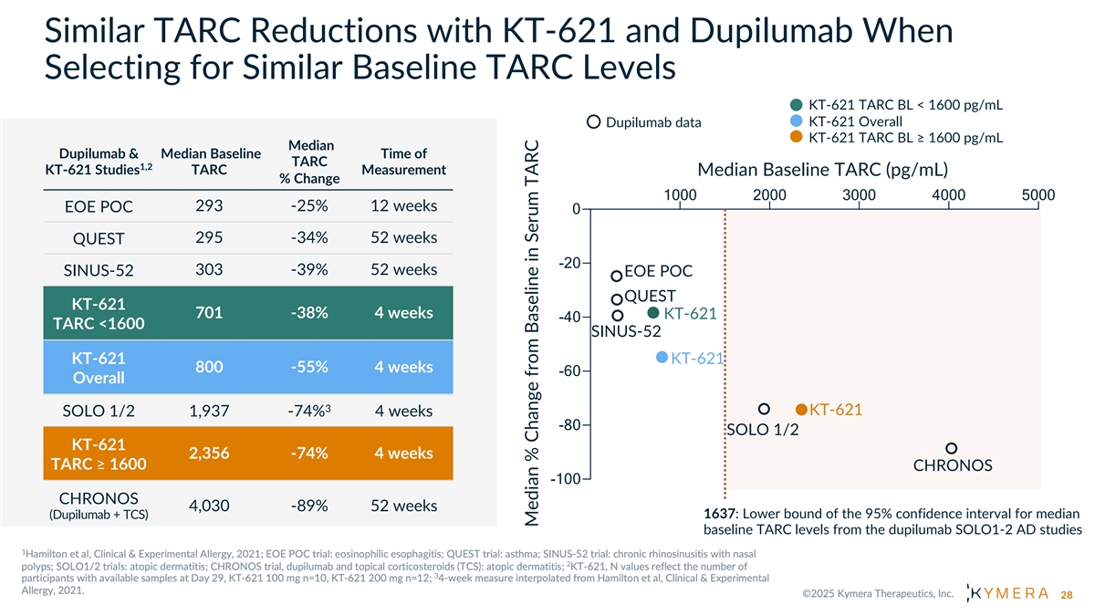 Higher Baseline TARC Levels Associated with Greater TARC Reductions Across Dupilumab and KT-621 Studies KT-621 Ph1b AD 100 mg Dupilumab data KT-621 Ph1b AD 200 mg Median Dupilumab & Median Baseline Time of TARC 1,2 KT-621 Studies TARC Measurement Median Baseline TARC (pg/mL) % Change 1000 2000 3000 4000 5000 293 -25% 12 weeks EOE POC 0 295 -34% 52 weeks QUEST -20 303 -39% 52 weeks SINUS-52 EOE POC QUEST KT-621 868 -48% 4 weeks SINUS-52 -40 100 mg KT-621 100 mg KT-621 KT-621 200 mg 800 -55% 4 weeks -60 200 mg 3 SOLO 1/2 1,937 -74% 4 weeks -80 SOLO 1/2 CHRONOS 4,030 -89% 52 weeks (Dupilumab + TCS) CHRONOS -100 27 Median % Change from Baseline in Serum TARC