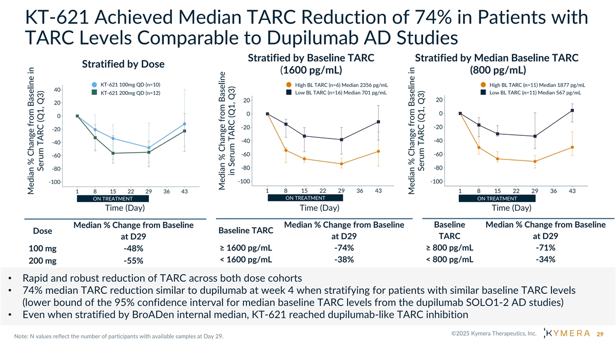 Similar TARC Reductions with KT-621 and Dupilumab When Selecting for Similar Baseline TARC Levels KT-621 TARC BL < 1600 pg/mL KT-621 Overall Dupilumab data KT-621 TARC BL ≥ 1600 pg/mL Median Dupilumab & Median Baseline Time of TARC 1,2 KT-621 Studies TARC Measurement Median Baseline TARC (pg/mL) % Change 1000 2000 3000 4000 5000 293 -25% 12 weeks EOE POC 0 295 -34% 52 weeks QUEST -20 303 -39% 52 weeks SINUS-52 EOE POC QUEST KT-621 701 -38% 4 weeks KT-621 -40 TARC <1600 SINUS-52 KT-621 KT-621 800 -55% 4 weeks -60 Overall 3 KT-621 SOLO 1/2 1,937 -74% 4 weeks -80 SOLO 1/2 KT-621 2,356 -74% 4 weeks TARC ≥ 1600 CHRONOS -100 CHRONOS 4,030 -89% 52 weeks (Dupilumab + TCS) 1637: Lower bound of the 95% confidence interval for median baseline TARC levels from the dupilumab SOLO1-2 AD studies 28 Median % Change from Baseline in Serum TARC