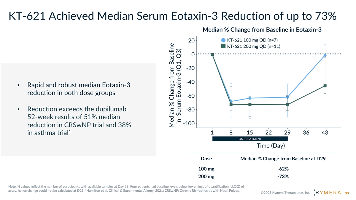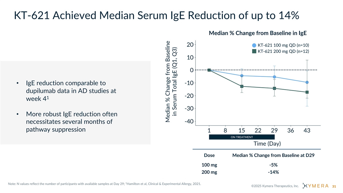 KT-621 Achieved Median Serum Eotaxin-3 Reduction of up to 73% Median % Change from Baseline in Eotaxin-3 KT-621 100 mg QD (n=7) KT-621 200 mg QD (n=11) • Rapid and robust median Eotaxin-3 reduction in both dose groups • Reduction exceeds the dupilumab 52-week results of 51% median reduction in CRSwNP trial and 38% 1 in asthma trial ON TREATMENT Time (Day) Dose Median % Change from Baseline at D29 100 mg -62% 200 mg -73% 30 Median % Change from Baseline in Serum Eotaxin-3 (Q1, Q3)