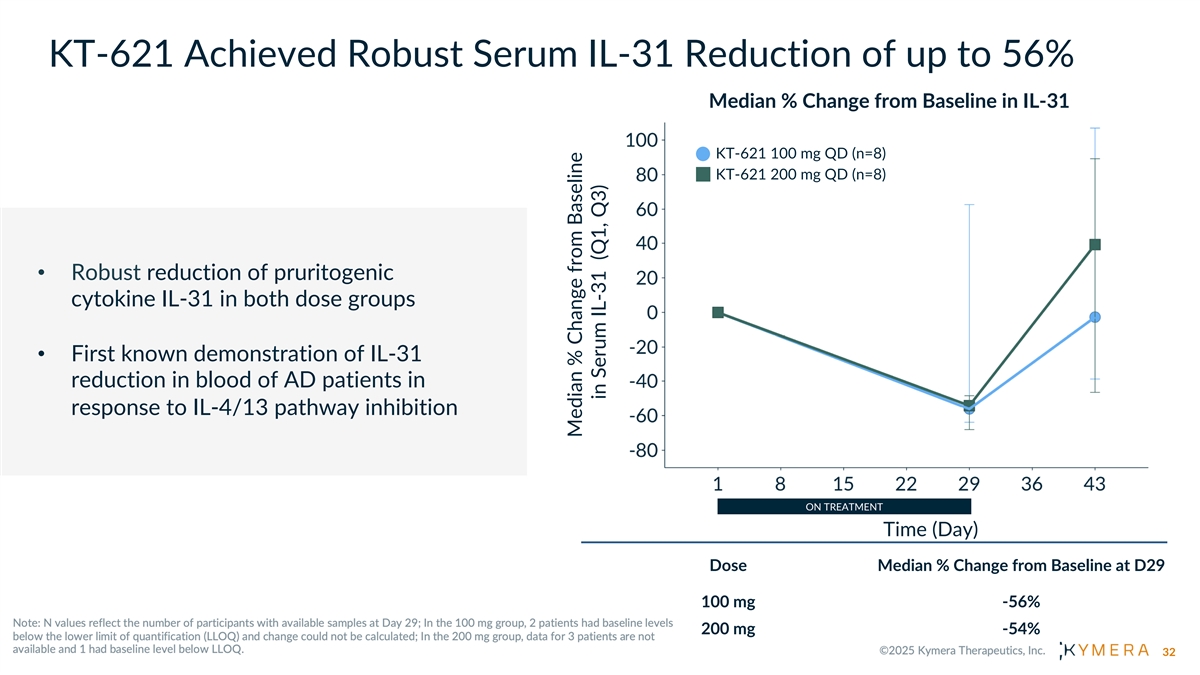 KT-621 Achieved Median Serum IgE Reduction of up to 14% Median % Change from Baseline in IgE KT-621 100 mg QD (n=10) KT-621 200 mg QD (n=12) • IgE reduction comparable to dupilumab data in AD studies at 1 week 4 • More robust IgE reduction often necessitates several months of pathway suppression ON TREATMENT Time (Day) Dose Median % Change from Baseline at D29 100 mg -5% 200 mg -14% 31 Median % Change from Baseline in Serum Total IgE (Q1, Q3)