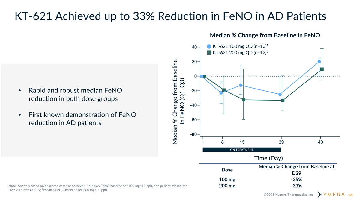 KT-621 Achieved Robust Serum IL-31 Reduction of up to 56% Median % Change from Baseline in IL-31 KT-621 100 mg QD (n=8) KT-621 200 mg QD (n=8) • Robust reduction of pruritogenic cytokine IL-31 in both dose groups • First known demonstration of IL-31 reduction in blood of AD patients in response to IL-4/13 pathway inhibition ON TREATMENT Time (Day) Dose Median % Change from Baseline at D29 100 mg -56% 200 mg -54% 32 Median % Change from Baseline in Serum IL-31 (Q1, Q3)