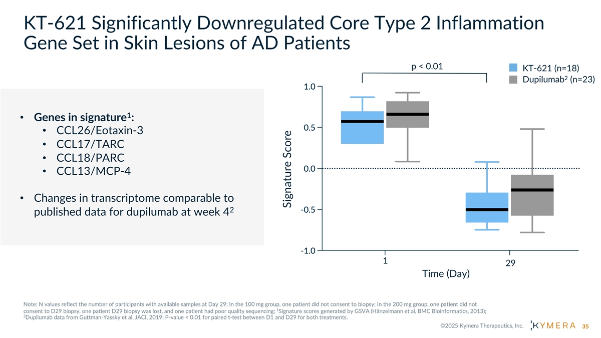 KT-621 Significantly Downregulated Core Type 2 Inflammation Gene Set in Skin Lesions of AD Patients p < 0.01 KT-621 (n=18) 2 Dupilumab (n=23) 1 • Genes in signature : • CCL26/Eotaxin-3 • CCL17/TARC • CCL18/PARC • CCL13/MCP-4 • Changes in transcriptome comparable to 2 published data for dupilumab at week 4 1 29 Time (Day) 35 Signature Score