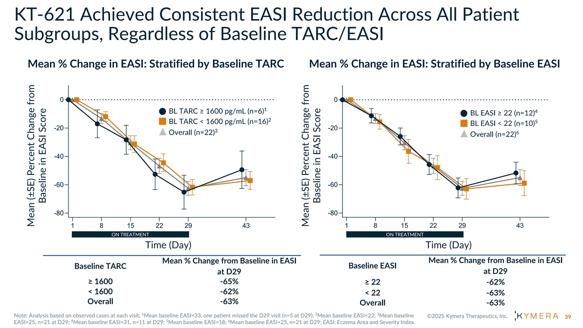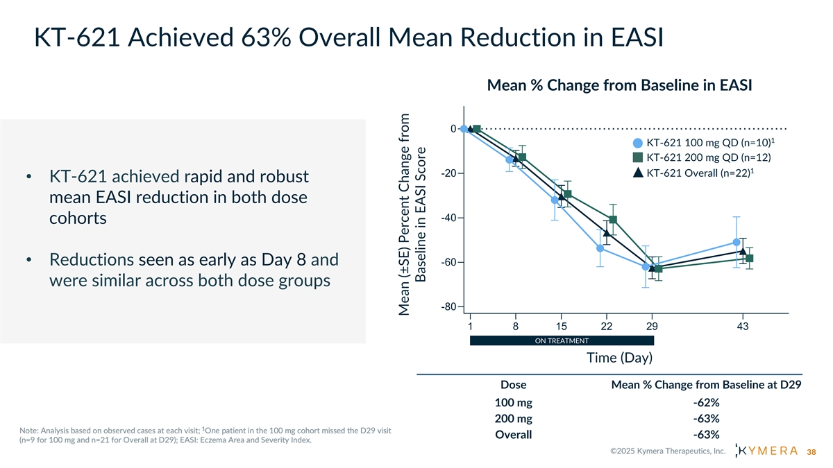 KT-621 Achieved 63% Overall Mean Reduction in EASI Mean % Change from Baseline in EASI 0 1 KT-621 100 mg QD (n=10) KT-621 200 mg QD (n=12) 1 -20 KT-621 Overall (n=22) • KT-621 achieved rapid and robust mean EASI reduction in both dose -40 cohorts • Reductions seen as early as Day 8 and -60 were similar across both dose groups -80 ! !# $$ $% &' ON TREATMENT Time (Day) Dose Mean % Change from Baseline at D29 100 mg -62% 200 mg -63% Overall -63% 38 Mean (±SE) Percent Change from Baseline in EASI Score