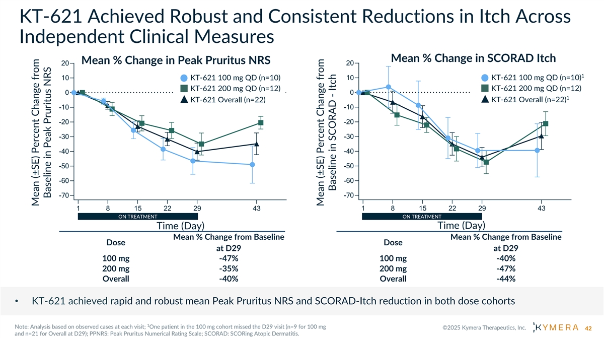 KT-621 Achieved 48% Overall Mean Reduction in SCORAD Mean % Change in Total SCORAD To Tot ta al l S SC COR ORA AD D 10 0 1 KT-621 100 mg QD (n=10) • SCORAD is a validated composite -10 KT-621 200 mg QD (n=12) measure of AD severity, integrating 1 KT-621 Overall (n=22) -20 extent, intensity, and patient-reported -30 impact -40 -50 • KT-621 achieved rapid and robust mean SCORAD reductions in both dose -60 cohorts -70 ! !# $$ $% &' ON TREATMENT Time (Day) Dose Mean % Change from Baseline at D29 100 mg -52% 200 mg -46% Overall -48% 41 Mean (±SE) Percent Change from Baseline in Total SCORAD