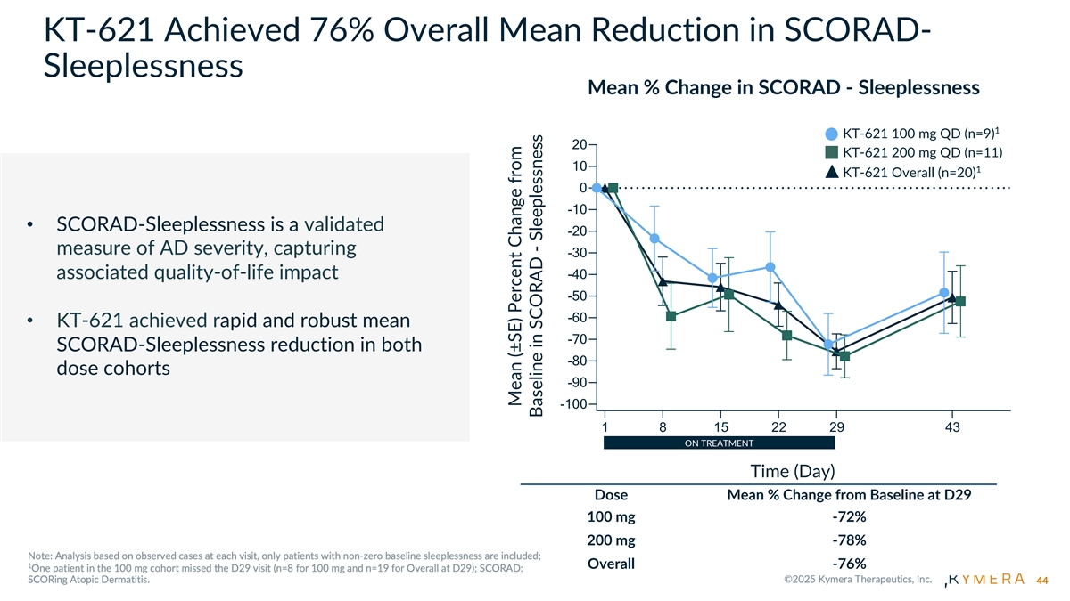 KT-621 Achieved 76% Overall Mean Reduction in SCORAD- Sleeplessness Mean % Change in SCORAD - Sleeplessness 1 KT-621 100 mg QD (n=9) 20 KT-621 200 mg QD (n=11) 10 1 KT-621 Overall (n=20) 0 -10 • SCORAD-Sleeplessness is a validated -20 measure of AD severity, capturing -30 associated quality-of-life impact -40 -50 -60 • KT-621 achieved rapid and robust mean -70 SCORAD-Sleeplessness reduction in both -80 dose cohorts -90 -100 ! !# $$ $% &' ON TREATMENT Time (Day) Dose Mean % Change from Baseline at D29 100 mg -72% 200 mg -78% Overall -76% 44 Mean (±SE) Percent Change from Baseline in SCORAD - Sleeplessness