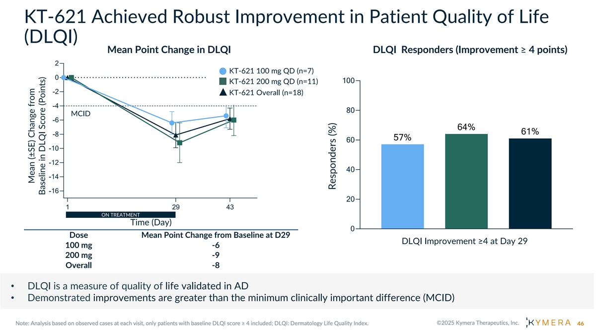 KT-621 Achieved Robust Improvement in Patient Quality of Life (POEM) Mean Point Change in POEM POEM Responders (Improvement ≥4 Points) 2 KT-621 100 mg QD (n=10) 0 KT-621 200 mg QD (n=12) 100 -2 KT-621 Overall (n=22) -4 MCID 80 75% -6 73% 70% -8 -10 60 -12 -14 40 -16 ! # $% 20 ON TREATMENT Time (Day) 0 Dose Mean Point Change from Baseline at D29 POEM Improvement ≥4 at Day 29 100 mg -7 200 mg -11 Overall -9 • POEM is a measure evaluating patient experience and impact on quality of life • Demonstrated improvements are greater than the minimum clinically important difference (MCID) 45 Mean (±SE) Change from Baseline in POEM Score (Points) Responders (%)
