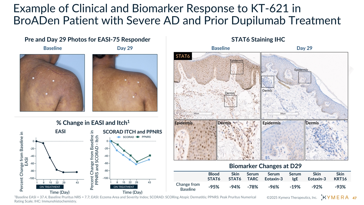 KT-621 Achieved Robust Improvement in Patient Quality of Life (DLQI) Mean Point Change in DLQI DLQI Responders (Improvement ≥ 4 points) 2 KT-621 100 mg QD (n=7) 0 100 KT-621 200 mg QD (n=11) -2 KT-621 Overall (n=18) -4 80 MCID -6 64% 61% -8 57% 60 -10 -12 40 -14 -16 20 ! # $% ON TREATMENT Time (Day) 0 Dose Mean Point Change from Baseline at D29 DLQI Improvement ≥4 at Day 29 100 mg -6 200 mg -9 Overall -8 • DLQI is a measure of quality of life validated in AD • Demonstrated improvements are greater than the minimum clinically important difference (MCID) 46 Mean (±SE) Change from Baseline in DLQI Score (Points) Responders (%)