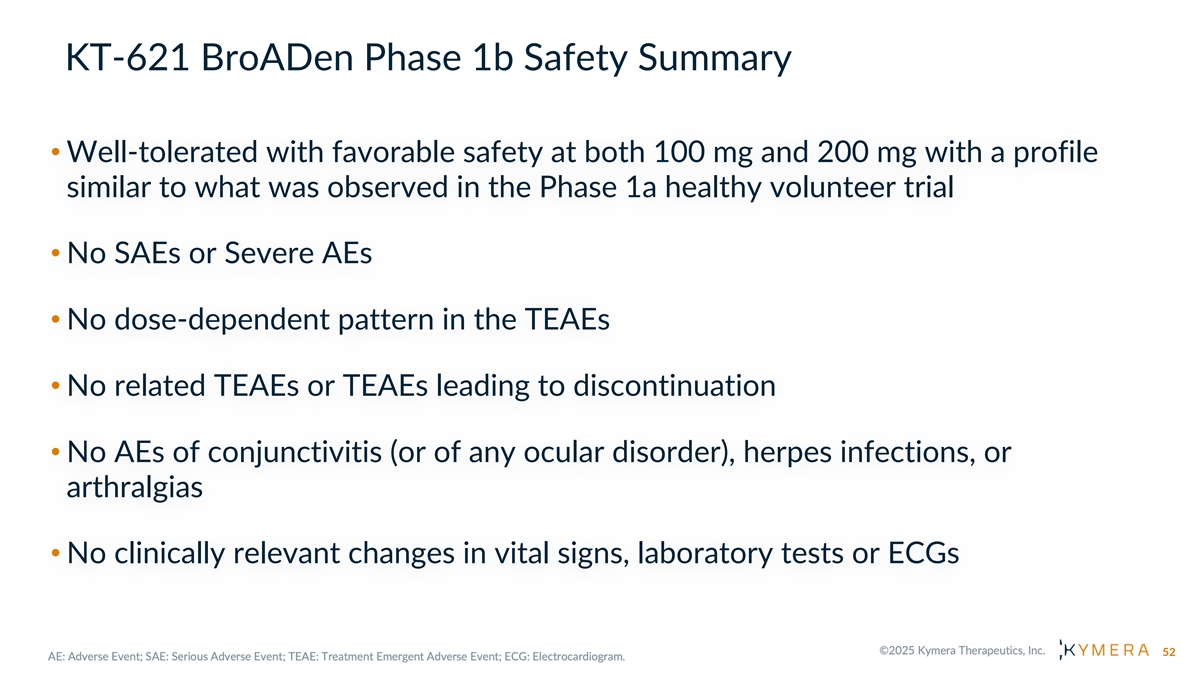 KT-621 BroADen Phase 1b Safety Summary • Well-tolerated with favorable safety at both 100 mg and 200 mg with a profile similar to what was observed in the Phase 1a healthy volunteer trial • No SAEs or Severe AEs • No dose-dependent pattern in the TEAEs • No related TEAEs or TEAEs leading to discontinuation • No AEs of conjunctivitis (or of any ocular disorder), herpes infections, or arthralgias • No clinically relevant changes in vital signs, laboratory tests or ECGs 52