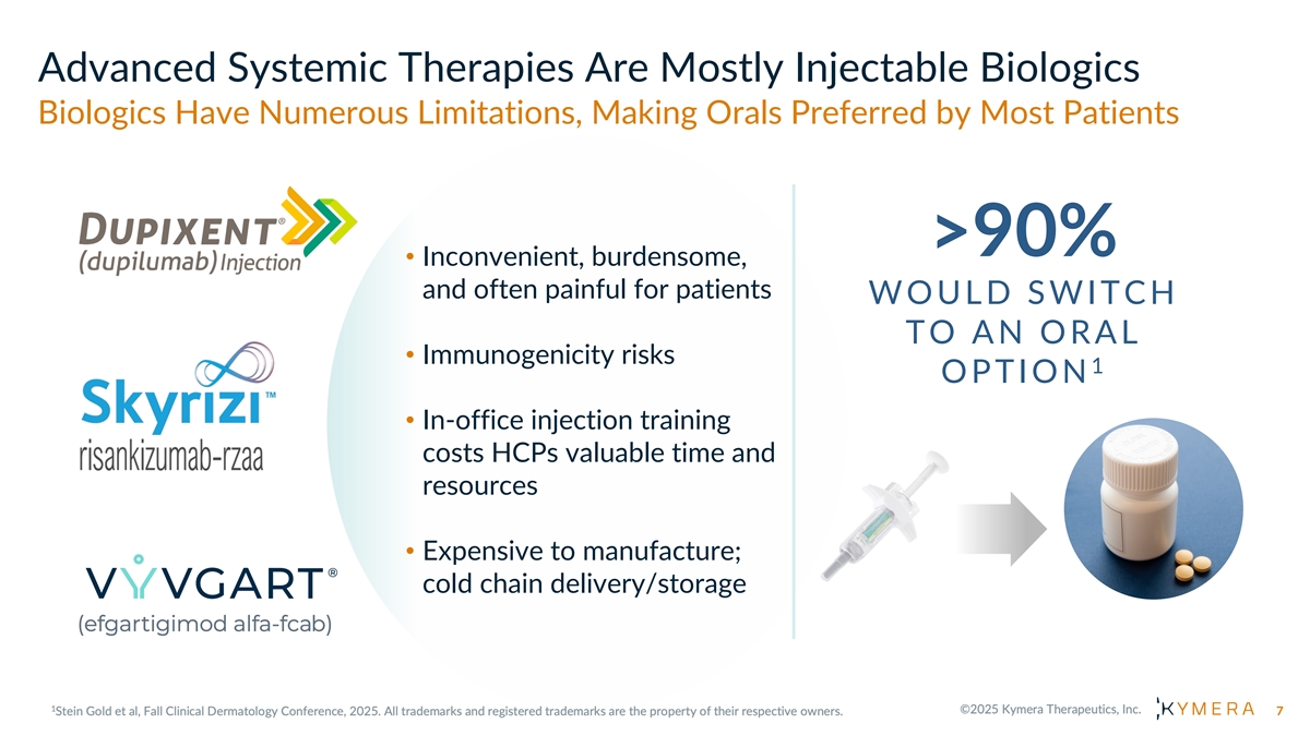 Advanced Systemic Therapies Are Mostly Injectable Biologics Biologics Have Numerous Limitations, Making Orals Preferred by Most Patients >90% • Inconvenient, burdensome, and often painful for patients WOULD SWITCH TO AN ORAL • Immunogenicity risks 1 OPTION • In-office injection training costs HCPs valuable time and resources • Expensive to manufacture; cold chain delivery/storage 7