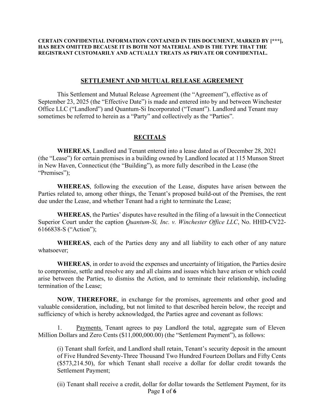 Page 1 of 6 CERTAIN CONFIDENTIAL INFORMATION CONTAINED IN THIS DOCUMENT, MARKED BY [***], HAS BEEN OMITTED BECAUSE IT IS BOTH NOT MATERIAL AND IS THE TYPE THAT THE REGISTRANT CUSTOMARILY AND ACTUALLY TREATS AS PRIVATE OR CONFIDENTIAL. SETTLEMENT AND MUTUAL RELEASE AGREEMENT This Settlement and Mutual Release Agreement (the “Agreement”), effective as of September 23, 2025 (the “Effective Date”) is made and entered into by and between Winchester Office LLC (“Landlord”) and Quantum-Si Incorporated (“Tenant”). Landlord and Tenant may sometimes be referred to herein as a “Party” and collectively as the “Parties”. RECITALS WHEREAS, Landlord and Tenant entered into a lease dated as of December 28, 2021 (the “Lease”) for certain premises in a building owned by Landlord located at 115 Munson Street in New Haven, Connecticut (the “Building”), as more fully described in the Lease (the “Premises”); WHEREAS, following the execution of the Lease, disputes have arisen between the Parties related to, among other things, the Tenant’s proposed build-out of the Premises, the rent due under the Lease, and whether Tenant had a right to terminate the Lease; WHEREAS, the Parties’ disputes have resulted in the filing of a lawsuit in the Connecticut Superior Court under the caption Quantum-Si, Inc. v. Winchester Office LLC, No. HHD-CV22- 6166838-S (“Action”); WHEREAS, each of the Parties deny any and all liability to each other of any nature whatsoever; WHEREAS, in order to avoid the expenses and uncertainty of litigation, the Parties desire to compromise, settle and resolve any and all claims and issues which have arisen or which could arise between the Parties, to dismiss the Action, and to terminate their relationship, including termination of the Lease; NOW, THEREFORE, in exchange for the promises, agreements and other good and valuable consideration, including, but not limited to that described herein below, the receipt and sufficiency of which is hereby acknowledged, the Parties agree and covenant as follows: 1. Payments. Tenant agrees to pay Landlord the total, aggregate sum of Eleven Million Dollars and Zero Cents ($11,000,000.00) (the “Settlement Payment”), as follows: (i) Tenant shall forfeit, and Landlord shall retain, Tenant’s security deposit in the amount of Five Hundred Seventy-Three Thousand Two Hundred Fourteen Dollars and Fifty Cents ($573,214.50), for which Tenant shall receive a dollar for dollar credit towards the Settlement Payment; (ii) Tenant shall receive a credit, dollar for dollar towards the Settlement Payment, for its