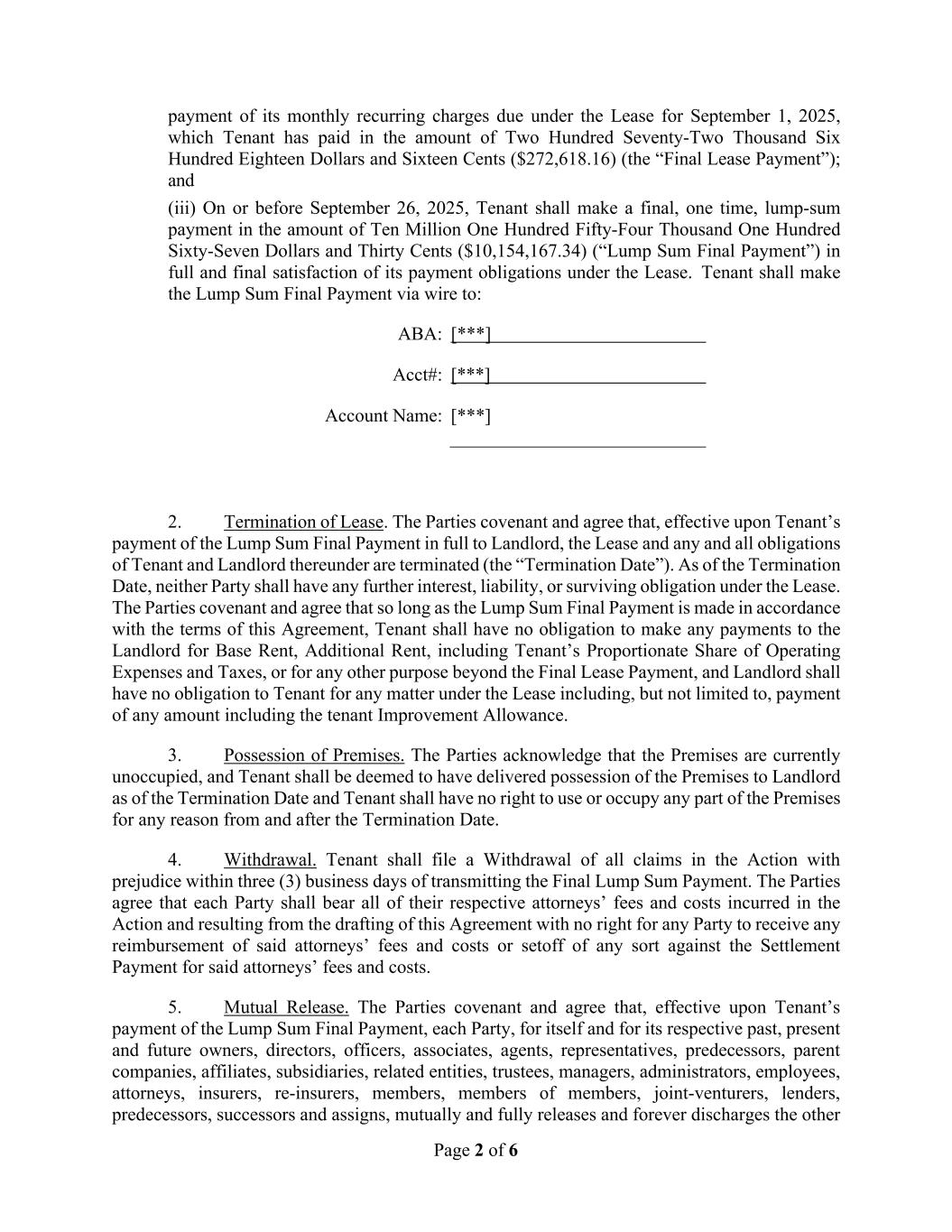 Page 2 of 6 payment of its monthly recurring charges due under the Lease for September 1, 2025, which Tenant has paid in the amount of Two Hundred Seventy-Two Thousand Six Hundred Eighteen Dollars and Sixteen Cents ($272,618.16) (the “Final Lease Payment”); and (iii) On or before September 26, 2025, Tenant shall make a final, one time, lump-sum payment in the amount of Ten Million One Hundred Fifty-Four Thousand One Hundred Sixty-Seven Dollars and Thirty Cents ($10,154,167.34) (“Lump Sum Final Payment”) in full and final satisfaction of its payment obligations under the Lease. Tenant shall make the Lump Sum Final Payment via wire to: ABA: [***] Acct#: [***] Account Name: [***] 2. Termination of Lease. The Parties covenant and agree that, effective upon Tenant’s payment of the Lump Sum Final Payment in full to Landlord, the Lease and any and all obligations of Tenant and Landlord thereunder are terminated (the “Termination Date”). As of the Termination Date, neither Party shall have any further interest, liability, or surviving obligation under the Lease. The Parties covenant and agree that so long as the Lump Sum Final Payment is made in accordance with the terms of this Agreement, Tenant shall have no obligation to make any payments to the Landlord for Base Rent, Additional Rent, including Tenant’s Proportionate Share of Operating Expenses and Taxes, or for any other purpose beyond the Final Lease Payment, and Landlord shall have no obligation to Tenant for any matter under the Lease including, but not limited to, payment of any amount including the tenant Improvement Allowance. 3. Possession of Premises. The Parties acknowledge that the Premises are currently unoccupied, and Tenant shall be deemed to have delivered possession of the Premises to Landlord as of the Termination Date and Tenant shall have no right to use or occupy any part of the Premises for any reason from and after the Termination Date. 4. Withdrawal. Tenant shall file a Withdrawal of all claims in the Action with prejudice within three (3) business days of transmitting the Final Lump Sum Payment. The Parties agree that each Party shall bear all of their respective attorneys’ fees and costs incurred in the Action and resulting from the drafting of this Agreement with no right for any Party to receive any reimbursement of said attorneys’ fees and costs or setoff of any sort against the Settlement Payment for said attorneys’ fees and costs. 5. Mutual Release. The Parties covenant and agree that, effective upon Tenant’s payment of the Lump Sum Final Payment, each Party, for itself and for its respective past, present and future owners, directors, officers, associates, agents, representatives, predecessors, parent companies, affiliates, subsidiaries, related entities, trustees, managers, administrators, employees, attorneys, insurers, re-insurers, members, members of members, joint-venturers, lenders, predecessors, successors and assigns, mutually and fully releases and forever discharges the other