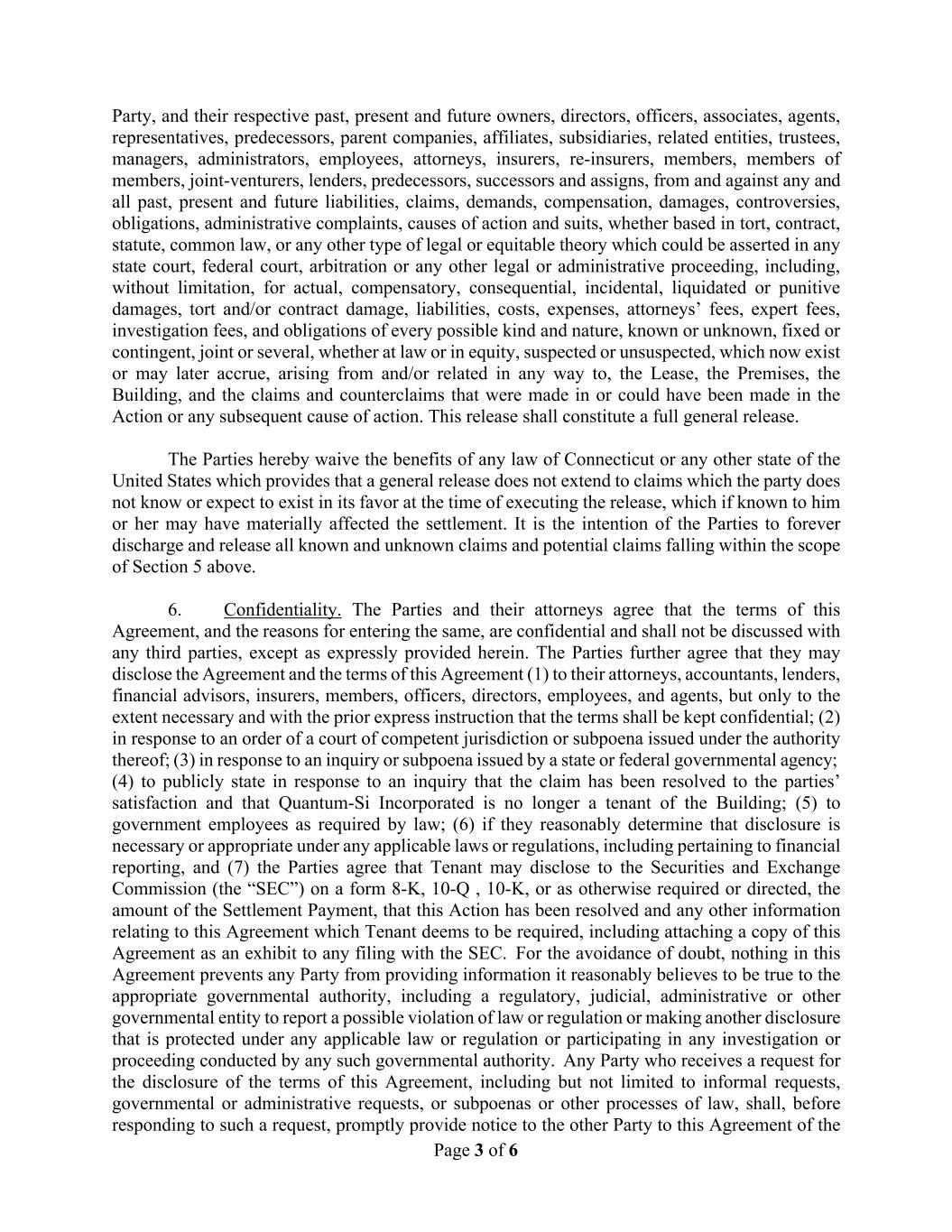Page 3 of 6 Party, and their respective past, present and future owners, directors, officers, associates, agents, representatives, predecessors, parent companies, affiliates, subsidiaries, related entities, trustees, managers, administrators, employees, attorneys, insurers, re-insurers, members, members of members, joint-venturers, lenders, predecessors, successors and assigns, from and against any and all past, present and future liabilities, claims, demands, compensation, damages, controversies, obligations, administrative complaints, causes of action and suits, whether based in tort, contract, statute, common law, or any other type of legal or equitable theory which could be asserted in any state court, federal court, arbitration or any other legal or administrative proceeding, including, without limitation, for actual, compensatory, consequential, incidental, liquidated or punitive damages, tort and/or contract damage, liabilities, costs, expenses, attorneys’ fees, expert fees, investigation fees, and obligations of every possible kind and nature, known or unknown, fixed or contingent, joint or several, whether at law or in equity, suspected or unsuspected, which now exist or may later accrue, arising from and/or related in any way to, the Lease, the Premises, the Building, and the claims and counterclaims that were made in or could have been made in the Action or any subsequent cause of action. This release shall constitute a full general release. The Parties hereby waive the benefits of any law of Connecticut or any other state of the United States which provides that a general release does not extend to claims which the party does not know or expect to exist in its favor at the time of executing the release, which if known to him or her may have materially affected the settlement. It is the intention of the Parties to forever discharge and release all known and unknown claims and potential claims falling within the scope of Section 5 above. 6. Confidentiality. The Parties and their attorneys agree that the terms of this Agreement, and the reasons for entering the same, are confidential and shall not be discussed with any third parties, except as expressly provided herein. The Parties further agree that they may disclose the Agreement and the terms of this Agreement (1) to their attorneys, accountants, lenders, financial advisors, insurers, members, officers, directors, employees, and agents, but only to the extent necessary and with the prior express instruction that the terms shall be kept confidential; (2) in response to an order of a court of competent jurisdiction or subpoena issued under the authority thereof; (3) in response to an inquiry or subpoena issued by a state or federal governmental agency; (4) to publicly state in response to an inquiry that the claim has been resolved to the parties’ satisfaction and that Quantum-Si Incorporated is no longer a tenant of the Building; (5) to government employees as required by law; (6) if they reasonably determine that disclosure is necessary or appropriate under any applicable laws or regulations, including pertaining to financial reporting, and (7) the Parties agree that Tenant may disclose to the Securities and Exchange Commission (the “SEC”) on a form 8-K, 10-Q , 10-K, or as otherwise required or directed, the amount of the Settlement Payment, that this Action has been resolved and any other information relating to this Agreement which Tenant deems to be required, including attaching a copy of this Agreement as an exhibit to any filing with the SEC. For the avoidance of doubt, nothing in this Agreement prevents any Party from providing information it reasonably believes to be true to the appropriate governmental authority, including a regulatory, judicial, administrative or other governmental entity to report a possible violation of law or regulation or making another disclosure that is protected under any applicable law or regulation or participating in any investigation or proceeding conducted by any such governmental authority. Any Party who receives a request for the disclosure of the terms of this Agreement, including but not limited to informal requests, governmental or administrative requests, or subpoenas or other processes of law, shall, before responding to such a request, promptly provide notice to the other Party to this Agreement of the