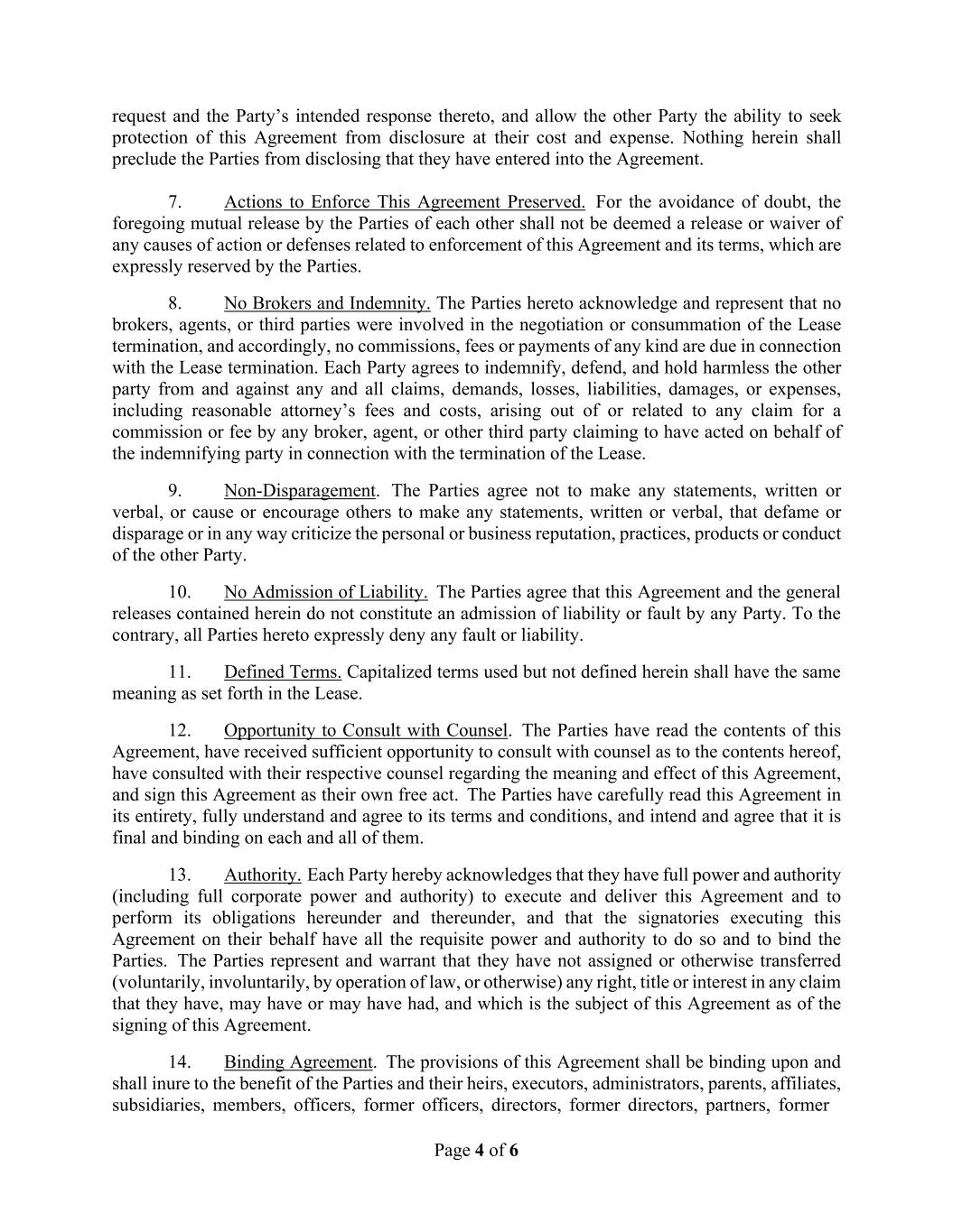 Page 4 of 6 request and the Party’s intended response thereto, and allow the other Party the ability to seek protection of this Agreement from disclosure at their cost and expense. Nothing herein shall preclude the Parties from disclosing that they have entered into the Agreement. 7. Actions to Enforce This Agreement Preserved. For the avoidance of doubt, the foregoing mutual release by the Parties of each other shall not be deemed a release or waiver of any causes of action or defenses related to enforcement of this Agreement and its terms, which are expressly reserved by the Parties. 8. No Brokers and Indemnity. The Parties hereto acknowledge and represent that no brokers, agents, or third parties were involved in the negotiation or consummation of the Lease termination, and accordingly, no commissions, fees or payments of any kind are due in connection with the Lease termination. Each Party agrees to indemnify, defend, and hold harmless the other party from and against any and all claims, demands, losses, liabilities, damages, or expenses, including reasonable attorney’s fees and costs, arising out of or related to any claim for a commission or fee by any broker, agent, or other third party claiming to have acted on behalf of the indemnifying party in connection with the termination of the Lease. 9. Non-Disparagement. The Parties agree not to make any statements, written or verbal, or cause or encourage others to make any statements, written or verbal, that defame or disparage or in any way criticize the personal or business reputation, practices, products or conduct of the other Party. 10. No Admission of Liability. The Parties agree that this Agreement and the general releases contained herein do not constitute an admission of liability or fault by any Party. To the contrary, all Parties hereto expressly deny any fault or liability. 11. Defined Terms. Capitalized terms used but not defined herein shall have the same meaning as set forth in the Lease. 12. Opportunity to Consult with Counsel. The Parties have read the contents of this Agreement, have received sufficient opportunity to consult with counsel as to the contents hereof, have consulted with their respective counsel regarding the meaning and effect of this Agreement, and sign this Agreement as their own free act. The Parties have carefully read this Agreement in its entirety, fully understand and agree to its terms and conditions, and intend and agree that it is final and binding on each and all of them. 13. Authority. Each Party hereby acknowledges that they have full power and authority (including full corporate power and authority) to execute and deliver this Agreement and to perform its obligations hereunder and thereunder, and that the signatories executing this Agreement on their behalf have all the requisite power and authority to do so and to bind the Parties. The Parties represent and warrant that they have not assigned or otherwise transferred (voluntarily, involuntarily, by operation of law, or otherwise) any right, title or interest in any claim that they have, may have or may have had, and which is the subject of this Agreement as of the signing of this Agreement. 14. Binding Agreement. The provisions of this Agreement shall be binding upon and shall inure to the benefit of the Parties and their heirs, executors, administrators, parents, affiliates, subsidiaries, members, officers, former officers, directors, former directors, partners, former