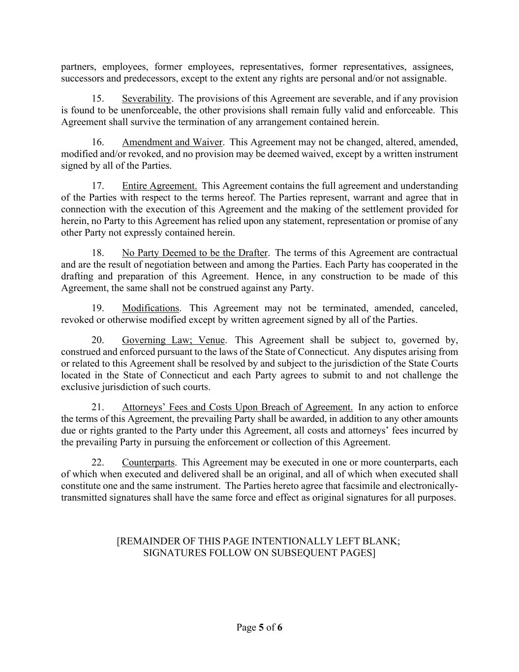 Page 5 of 6 partners, employees, former employees, representatives, former representatives, assignees, successors and predecessors, except to the extent any rights are personal and/or not assignable. 15. Severability. The provisions of this Agreement are severable, and if any provision is found to be unenforceable, the other provisions shall remain fully valid and enforceable. This Agreement shall survive the termination of any arrangement contained herein. 16. Amendment and Waiver. This Agreement may not be changed, altered, amended, modified and/or revoked, and no provision may be deemed waived, except by a written instrument signed by all of the Parties. 17. Entire Agreement. This Agreement contains the full agreement and understanding of the Parties with respect to the terms hereof. The Parties represent, warrant and agree that in connection with the execution of this Agreement and the making of the settlement provided for herein, no Party to this Agreement has relied upon any statement, representation or promise of any other Party not expressly contained herein. 18. No Party Deemed to be the Drafter. The terms of this Agreement are contractual and are the result of negotiation between and among the Parties. Each Party has cooperated in the drafting and preparation of this Agreement. Hence, in any construction to be made of this Agreement, the same shall not be construed against any Party. 19. Modifications. This Agreement may not be terminated, amended, canceled, revoked or otherwise modified except by written agreement signed by all of the Parties. 20. Governing Law; Venue. This Agreement shall be subject to, governed by, construed and enforced pursuant to the laws of the State of Connecticut. Any disputes arising from or related to this Agreement shall be resolved by and subject to the jurisdiction of the State Courts located in the State of Connecticut and each Party agrees to submit to and not challenge the exclusive jurisdiction of such courts. 21. Attorneys’ Fees and Costs Upon Breach of Agreement. In any action to enforce the terms of this Agreement, the prevailing Party shall be awarded, in addition to any other amounts due or rights granted to the Party under this Agreement, all costs and attorneys’ fees incurred by the prevailing Party in pursuing the enforcement or collection of this Agreement. 22. Counterparts. This Agreement may be executed in one or more counterparts, each of which when executed and delivered shall be an original, and all of which when executed shall constitute one and the same instrument. The Parties hereto agree that facsimile and electronically- transmitted signatures shall have the same force and effect as original signatures for all purposes. [REMAINDER OF THIS PAGE INTENTIONALLY LEFT BLANK; SIGNATURES FOLLOW ON SUBSEQUENT PAGES]