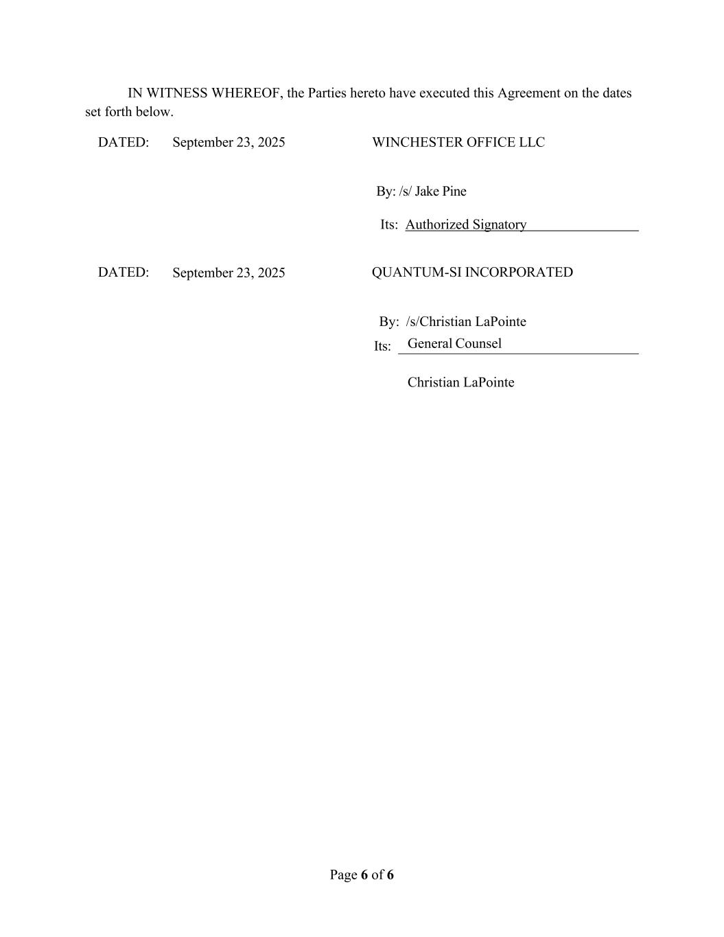 Page 6 of 6 IN WITNESS WHEREOF, the Parties hereto have executed this Agreement on the dates set forth below. DATED: September 23, 2025 WINCHESTER OFFICE LLC By: /s/ Jake Pine Its: Authorized Signatory DATED: September 23, 2025 QUANTUM-SI INCORPORATED By: /s/Christian LaPointe Its: General Counsel Christian LaPointe