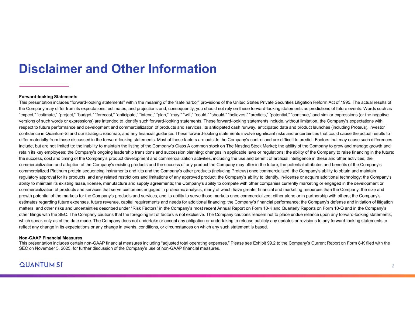 2 Disclaimer and Other Information Forward-looking Statements This presentation includes “forward-looking statements” within the meaning of the “safe harbor” provisions of the United States Private Securities Litigation Reform Act of 1995. The actual results of the Company may differ from its expectations, estimates, and projections and, consequently, you should not rely on these forward-looking statements as predictions of future events. Words such as “expect,” “estimate,” “project,” “budget,” “forecast,” “anticipate,” “intend,” “plan,” “may,” “will,” “could,” “should,” “believes,” “predicts,” “potential,” “continue,” and similar expressions (or the negative versions of such words or expressions) are intended to identify such forward-looking statements. These forward-looking statements include, without limitation, the Company’s expectations with respect to future performance and development and commercialization of products and services, its anticipated cash runway, anticipated data and product launches (including Proteus), investor confidence in Quantum-Si and our strategic roadmap, and any financial guidance. These forward-looking statements involve significant risks and uncertainties that could cause the actual results to differ materially from those discussed in the forward-looking statements. Most of these factors are outside the Company’s control and are difficult to predict. Factors that may cause such differences include, but are not limited to: the inability to maintain the listing of the Company’s Class A common stock on The Nasdaq Stock Market; the ability of the Company to grow and manage growth and retain its key employees; the Company’s ongoing leadership transitions and succession planning; changes in applicable laws or regulations; the ability of the Company to raise financing in the future; the success, cost and timing of the Company’s product development and commercialization activities, including the use and benefit of artificial intelligence in these and other activities; the commercialization and adoption of the Company’s existing products and the success of any product the Company may offer in the future; the potential attributes and benefits of the Company’s commercialized Platinum protein sequencing instruments and kits and the Company’s other products (including Proteus) once commercialized; the Company’s ability to obtain and maintain regulatory approval for its products, and any related restrictions and limitations of any approved product; the Company’s ability to identify, in-license or acquire additional technology; the Company’s ability to maintain its existing lease, license, manufacture and supply agreements; the Company’s ability to compete with other companies currently marketing or engaged in the development or commercialization of products and services that serve customers engaged in proteomic analysis, many of which have greater financial and marketing resources than the Company; the size and growth potential of the markets for the Company’s products and services, and its ability to serve those markets once commercialized, either alone or in partnership with others; the Company’s estimates regarding future expenses, future revenue, capital requirements and needs for additional financing; the Company’s financial performance; the Company's defense and initiation of litigation matters; and other risks and uncertainties described under “Risk Factors” in the Company’s most recent Annual Report on Form 10-K and Quarterly Reports on Form 10-Q and in the Company’s other filings with the SEC. The Company cautions that the foregoing list of factors is not exclusive. The Company cautions readers not to place undue reliance upon any forward-looking statements, which speak only as of the date made. The Company does not undertake or accept any obligation or undertaking to release publicly any updates or revisions to any forward-looking statements to reflect any change in its expectations or any change in events, conditions, or circumstances on which any such statement is based. Non-GAAP Financial Measures This presentation includes certain non-GAAP financial measures including “adjusted total operating expenses.” Please see Exhibit 99.2 to the Company’s Current Report on Form 8-K filed with the SEC on November 5, 2025, for further discussion of the Company’s use of non-GAAP financial measures.
