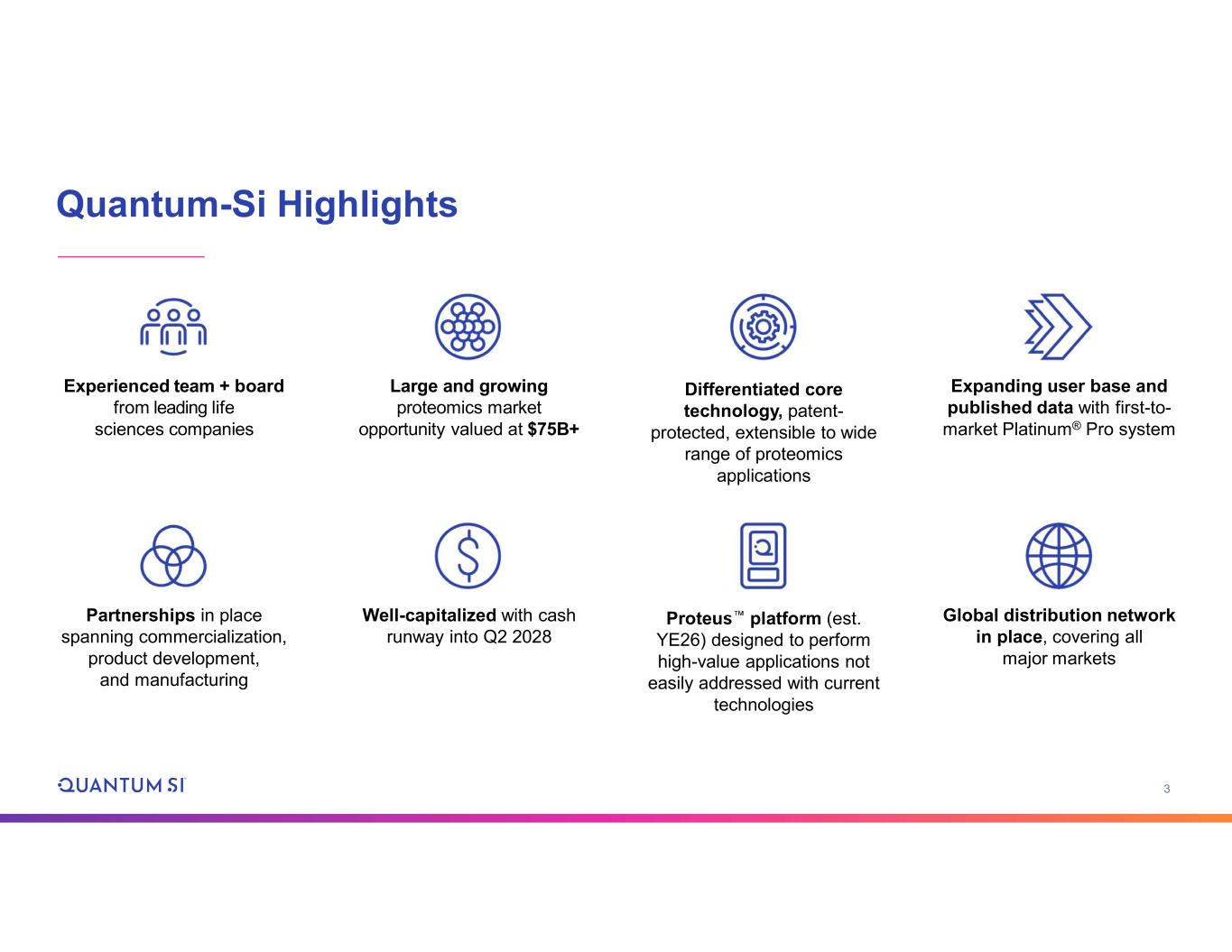 2 Disclaimer and Other Information Forward-looking Statements This presentation includes “forward-looking statements” within the meaning of the “safe harbor” provisions of the United States Private Securities Litigation Reform Act of 1995. The actual results of the Company may differ from its expectations, estimates, and projections and, consequently, you should not rely on these forward-looking statements as predictions of future events. Words such as “expect,” “estimate,” “project,” “budget,” “forecast,” “anticipate,” “intend,” “plan,” “may,” “will,” “could,” “should,” “believes,” “predicts,” “potential,” “continue,” and similar expressions (or the negative versions of such words or expressions) are intended to identify such forward-looking statements. These forward-looking statements include, without limitation, the Company’s expectations with respect to future performance and development and commercialization of products and services, its anticipated cash runway, anticipated data and product launches (including Proteus), investor confidence in Quantum-Si and our strategic roadmap, and any financial guidance. These forward-looking statements involve significant risks and uncertainties that could cause the actual results to differ materially from those discussed in the forward-looking statements. Most of these factors are outside the Company’s control and are difficult to predict. Factors that may cause such differences include, but are not limited to: the inability to maintain the listing of the Company’s Class A common stock on The Nasdaq Stock Market; the ability of the Company to grow and manage growth and retain its key employees; the Company’s ongoing leadership transitions and succession planning; changes in applicable laws or regulations; the ability of the Company to raise financing in the future; the success, cost and timing of the Company’s product development and commercialization activities, including the use and benefit of artificial intelligence in these and other activities; the commercialization and adoption of the Company’s existing products and the success of any product the Company may offer in the future; the potential attributes and benefits of the Company’s commercialized Platinum protein sequencing instruments and kits and the Company’s other products (including Proteus) once commercialized; the Company’s ability to obtain and maintain regulatory approval for its products, and any related restrictions and limitations of any approved product; the Company’s ability to identify, in-license or acquire additional technology; the Company’s ability to maintain its existing lease, license, manufacture and supply agreements; the Company’s ability to compete with other companies currently marketing or engaged in the development or commercialization of products and services that serve customers engaged in proteomic analysis, many of which have greater financial and marketing resources than the Company; the size and growth potential of the markets for the Company’s products and services, and its ability to serve those markets once commercialized, either alone or in partnership with others; the Company’s estimates regarding future expenses, future revenue, capital requirements and needs for additional financing; the Company’s financial performance; the Company's defense and initiation of litigation matters; and other risks and uncertainties described under “Risk Factors” in the Company’s most recent Annual Report on Form 10-K and Quarterly Reports on Form 10-Q and in the Company’s other filings with the SEC. The Company cautions that the foregoing list of factors is not exclusive. The Company cautions readers not to place undue reliance upon any forward-looking statements, which speak only as of the date made. The Company does not undertake or accept any obligation or undertaking to release publicly any updates or revisions to any forward-looking statements to reflect any change in its expectations or any change in events, conditions, or circumstances on which any such statement is based. Non-GAAP Financial Measures This presentation includes certain non-GAAP financial measures including “adjusted total operating expenses.” Please see Exhibit 99.2 to the Company’s Current Report on Form 8-K filed with the SEC on November 5, 2025, for further discussion of the Company’s use of non-GAAP financial measures.