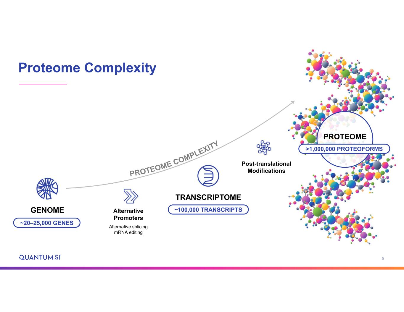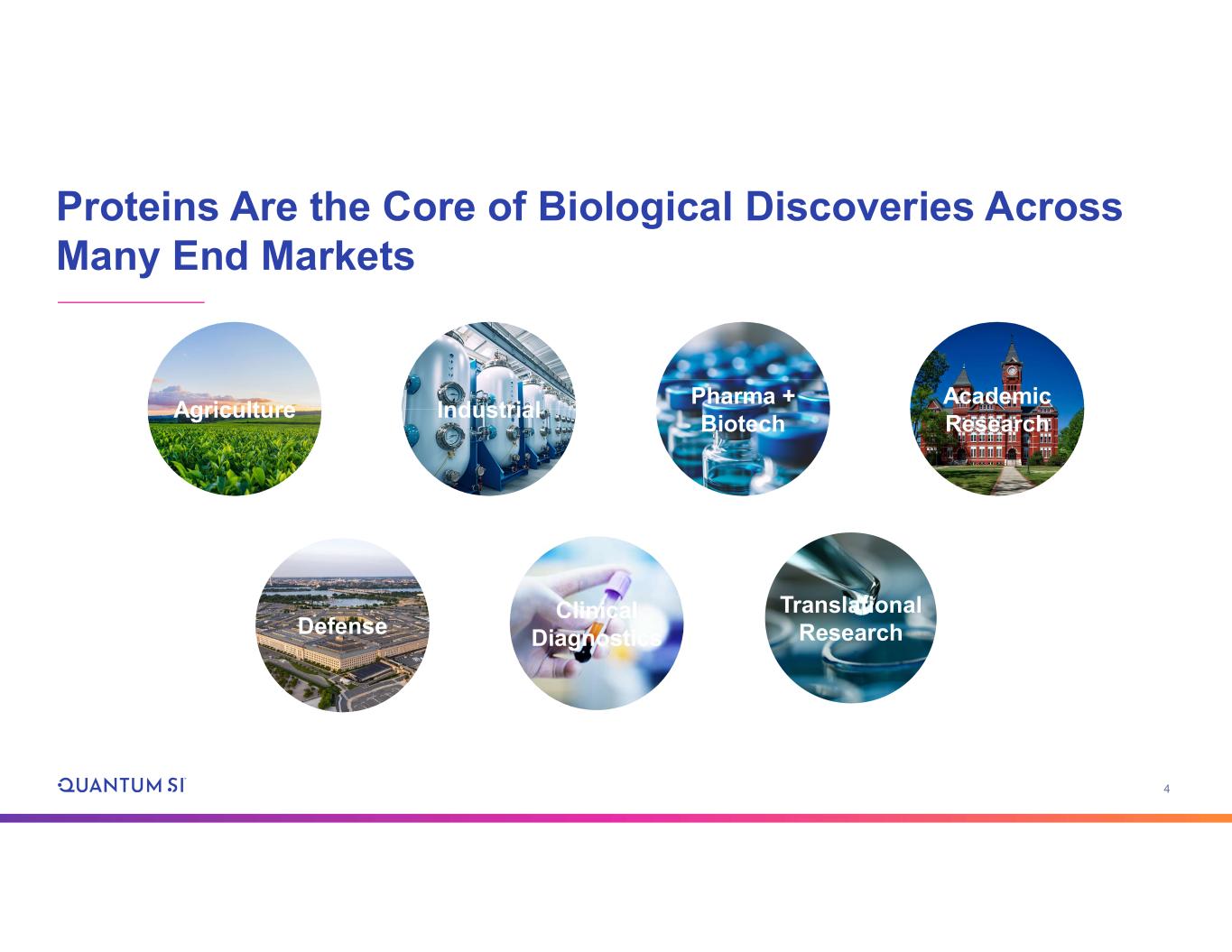 3 Quantum-Si Highlights Experienced team + board from leading life sciences companies Large and growing proteomics market opportunity valued at $75B+ Differentiated core technology, patent- protected, extensible to wide range of proteomics applications Partnerships in place spanning commercialization, product development, and manufacturing Well-capitalized with cash runway into Q2 2028 Proteus platform (est. YE26) designed to perform high-value applications not easily addressed with current technologies Global distribution network in place, covering all major markets Expanding user base and published data with first-to- market Platinum® Pro system