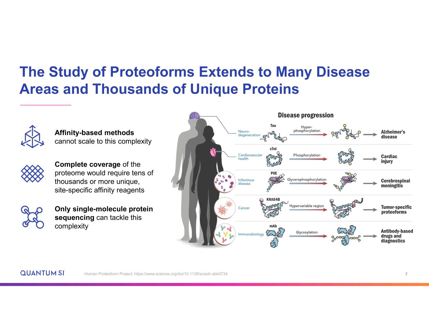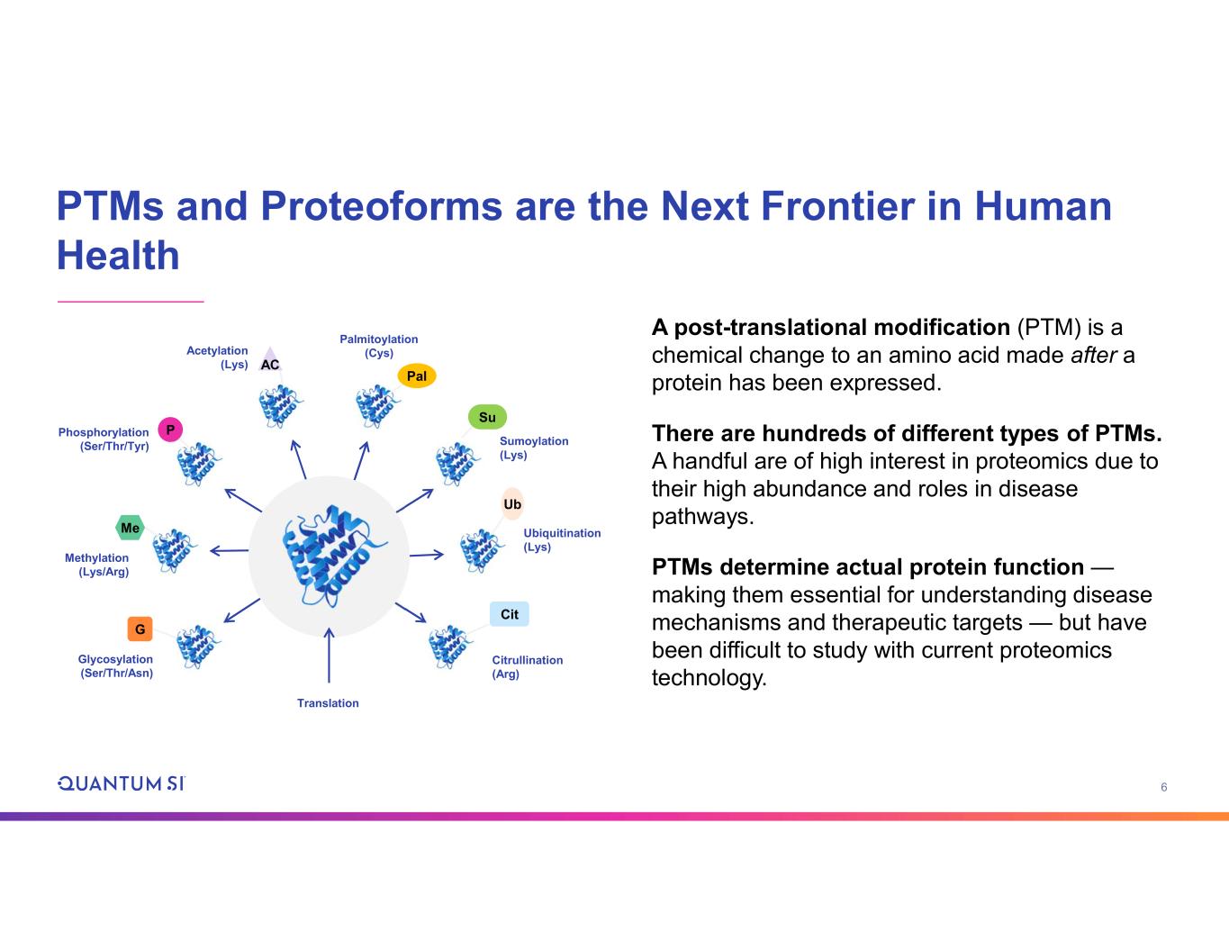 6 Su P G Me Methylation (Lys/Arg) Phosphorylation (Ser/Thr/Tyr) Palmitoylation (Cys) Sumoylation (Lys) Ubiquitination (Lys) Citrullination (Arg) AC Pal Ub Glycosylation (Ser/Thr/Asn) Acetylation (Lys) Translation Cit A post-translational modification (PTM) is a chemical change to an amino acid made after a protein has been expressed. There are hundreds of different types of PTMs. A handful are of high interest in proteomics due to their high abundance and roles in disease pathways. PTMs determine actual protein function — making them essential for understanding disease mechanisms and therapeutic targets — but have been difficult to study with current proteomics technology. PTMs and Proteoforms are the Next Frontier in Human Health
